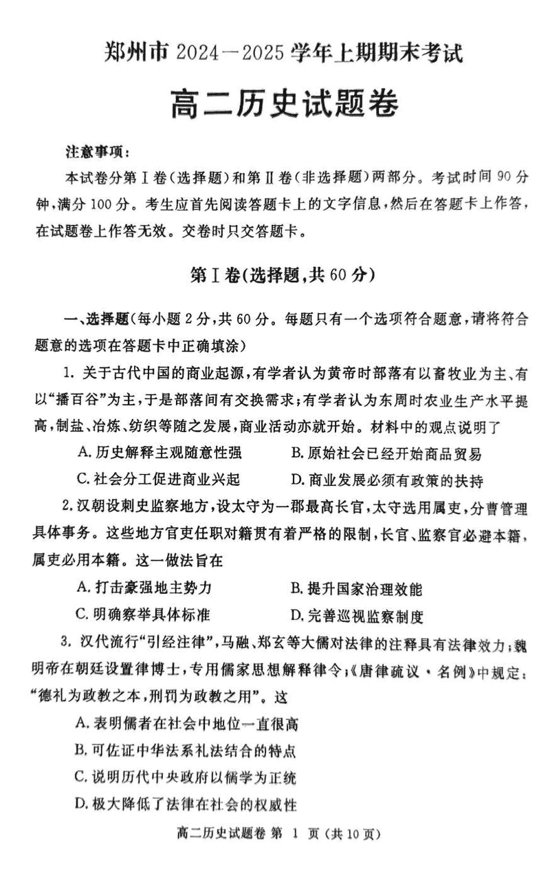 河南郑州2024-2025学年高二上学期期末历史试题及答案 时间:2025-01-27 河南 高中历史 四川遂宁2024-2025学年高二上学期期末历史考试已于近日开考,为方便考生考后及时查看考试情况,查漏补缺、弥补不足,本文整理了试题答案解析相关信息! 历史试题及答案解析