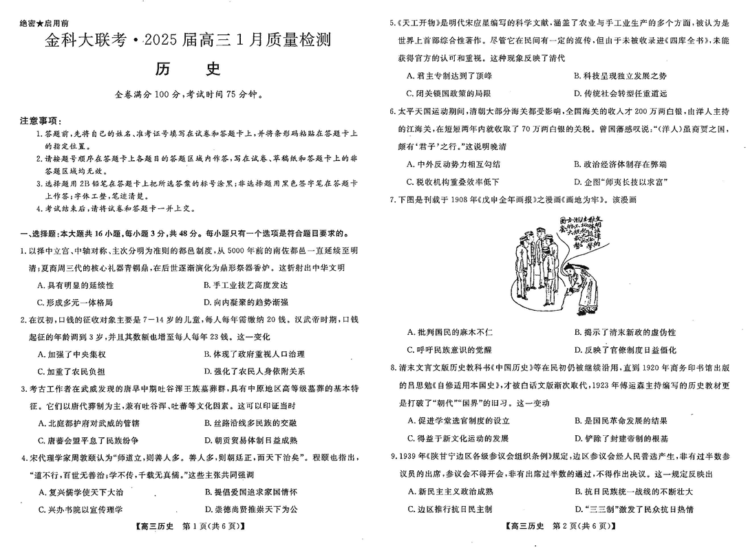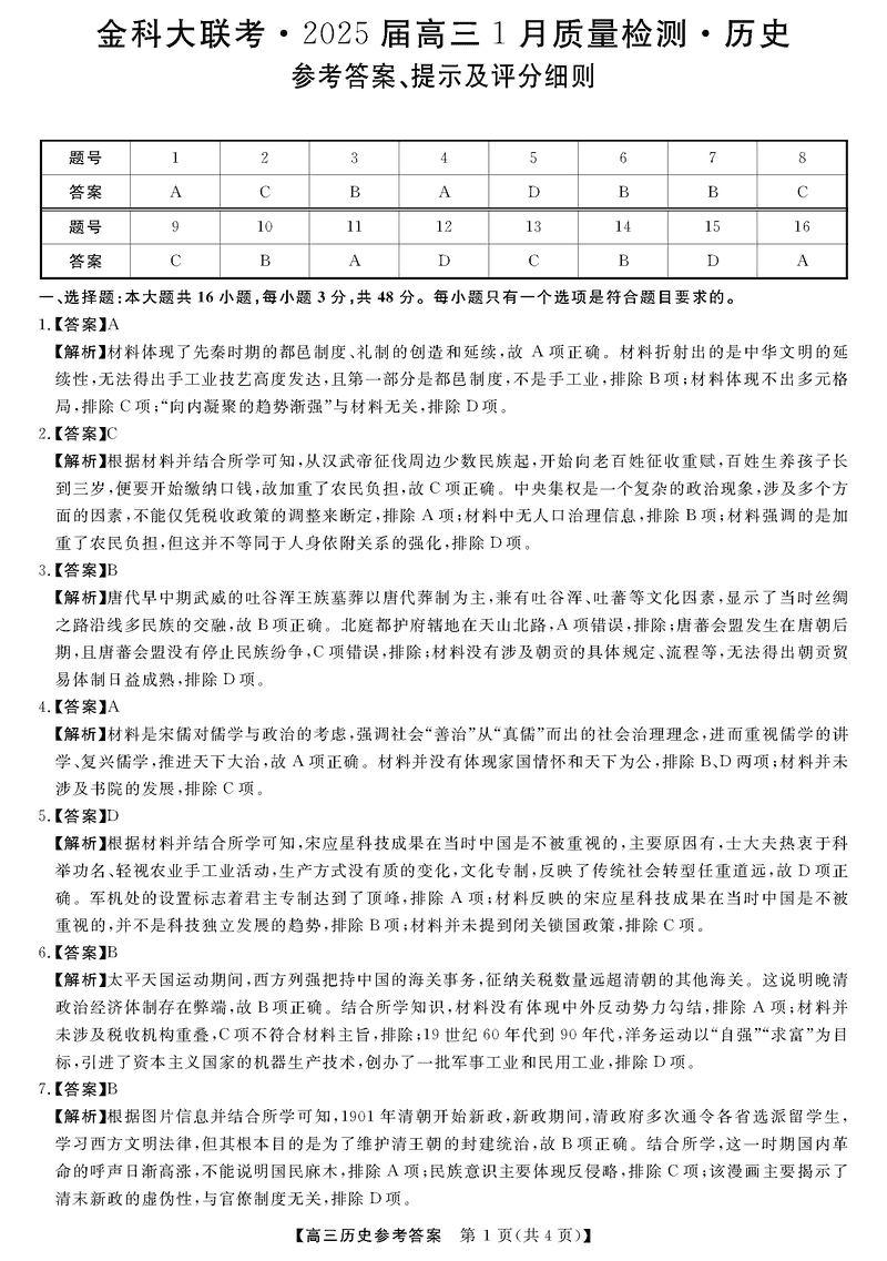 山西省金科大联考2025届高三1月质量检测历史试题及答案 时间:2025-01-27 山西 高中历史 山西省金科大联考2025届高三1月质量检测历史考试已于近日开考,为方便考生考后及时查看考试情况,查漏补缺、弥补不足,本文整理了试题答案解析相关信息! 历史试题及答案解析