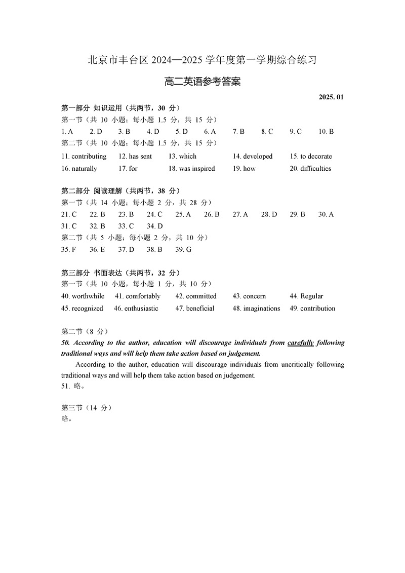 北京市丰台区2024-2025学年高二上学期期末英语试题及答案 时间:2025-01-27 北京 高中英语 北京市丰台区2024-2025学年高二上学期期末英语考试已于近日开考,为方便考生考后及时查看考试情况,查漏补缺、弥补不足,本文整理了试题答案解析相关信息! 英语试题及答案解析
