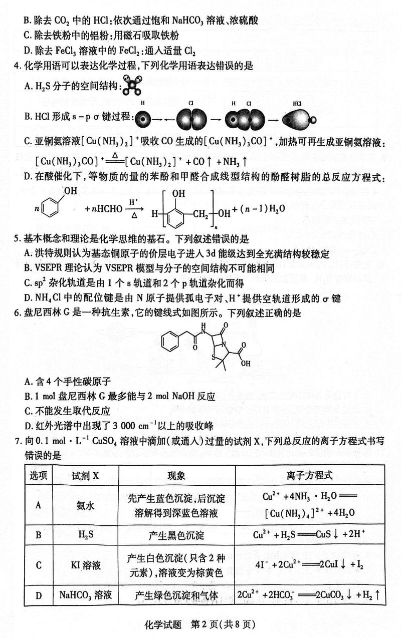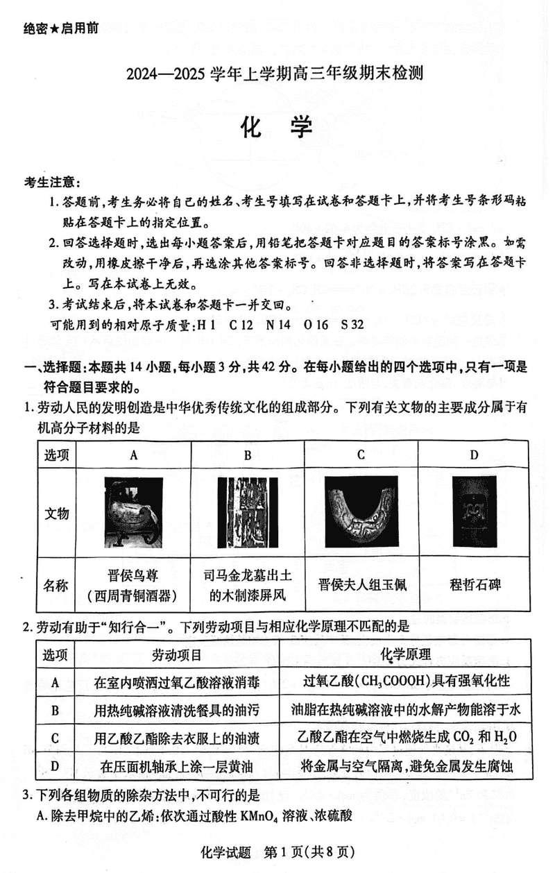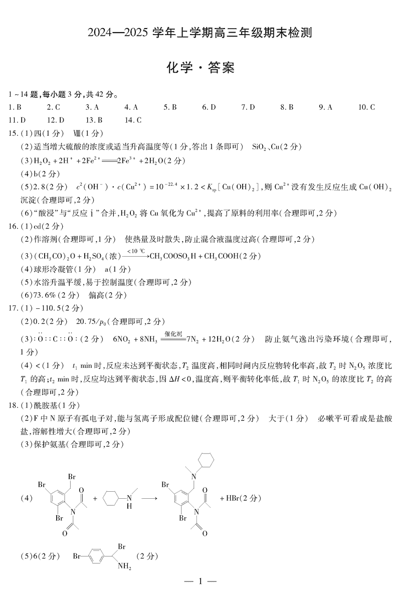 安徽天一大联考2025届高三上学期1月期末检测化学试题及答案