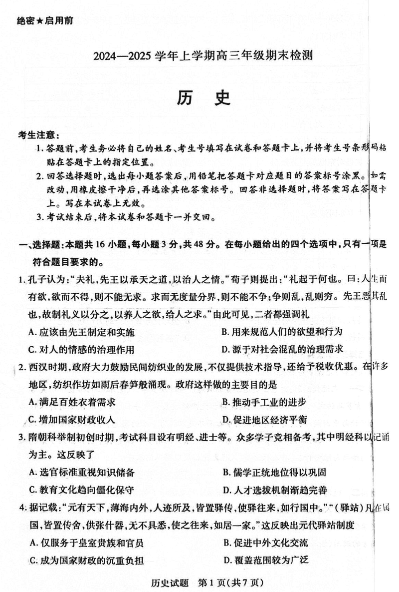 安徽天一大联考2025届高三上学期1月期末检测历史试题及答案