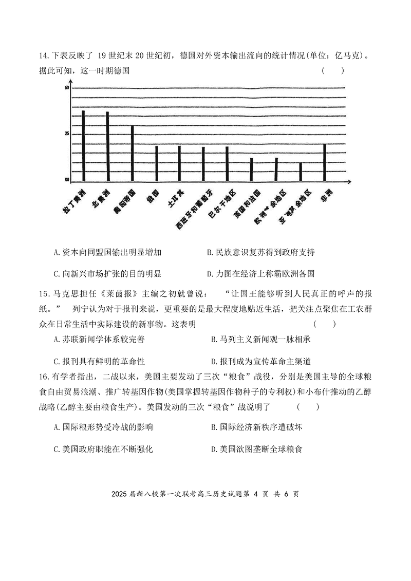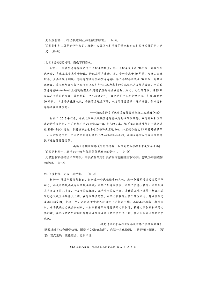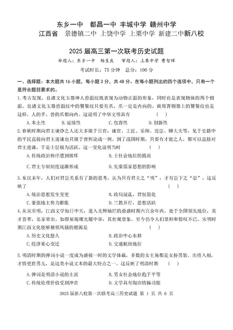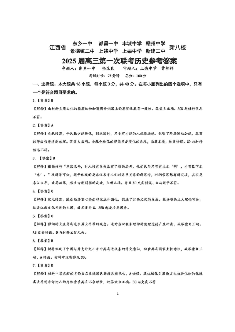 江西省新八校2025届高三第一次联考历史试题及答案 时间:2025-01-27 江西 文综试题 江西省新八校2025届高三第一次联考历史考试已于近日开考,为方便考生考后及时查看考试情况,查漏补缺、弥补不足,本文整理了试题答案解析相关信息! 汇总:江西省新八校2025届高三第一次联考试题及答案汇总 历史试题及答案解析