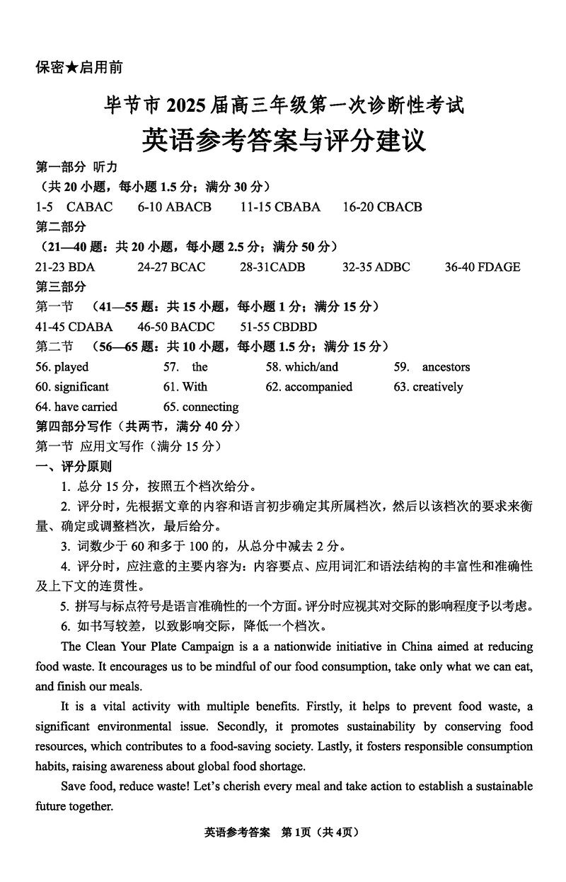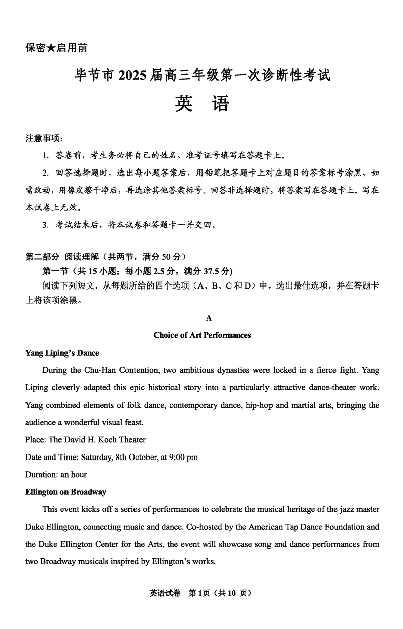 毕节一诊2025届高三上学期第一次诊断英语考试已于近日开考,为方便考生考后及时查看考试情况,查漏补缺、弥补不足,本文整理了试题答案解析相关信息!