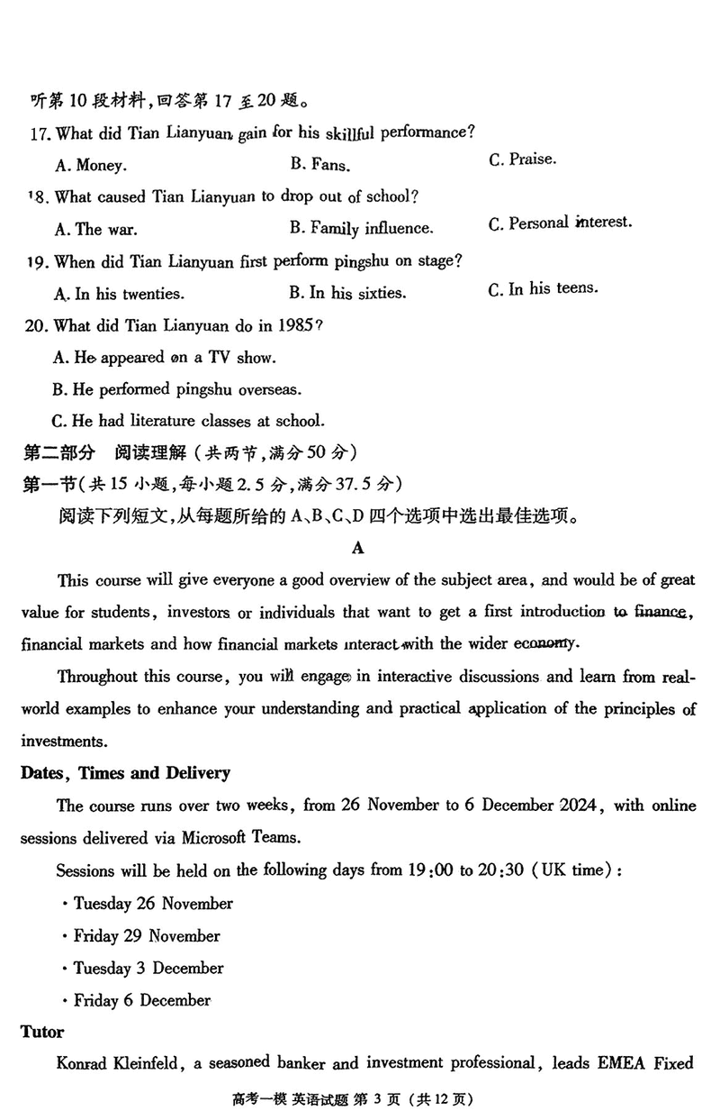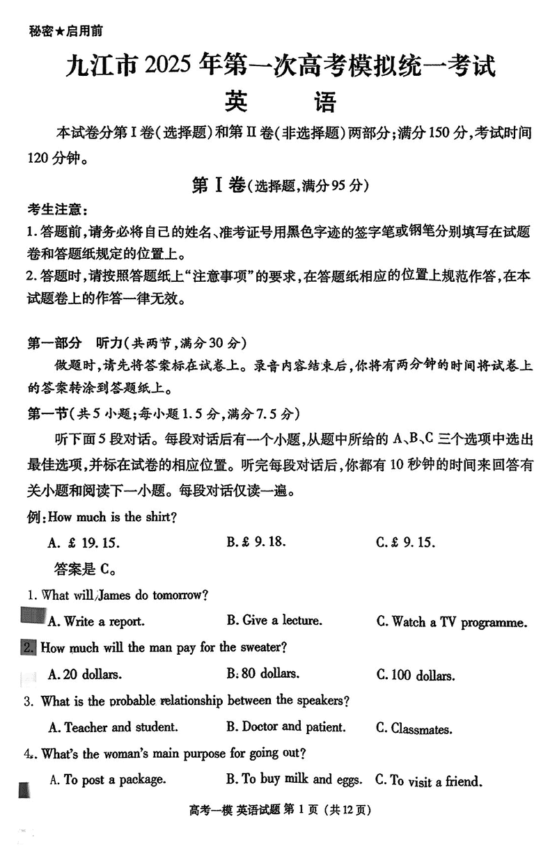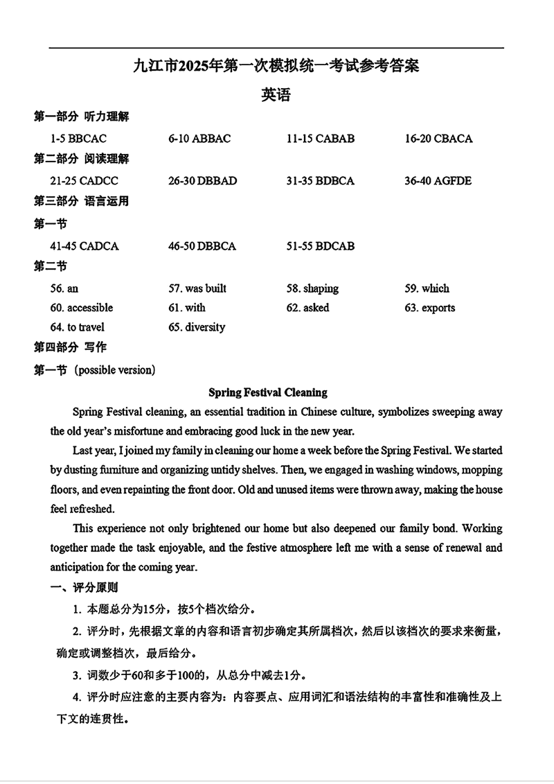 江西九江2025届高三上学期第一次模考英语试题及答案 时间:2025-02-02 江西 英语试题 江西九江2025届高三上学期第一次模考英语考试已于近日开考,为方便考生考后及时查看考试情况,查漏补缺、弥补不足,本文整理了试题答案解析相关信息! 汇总:江西九江2025届高三上学期第一次模考试题及答案汇总 英语试题及答案解析