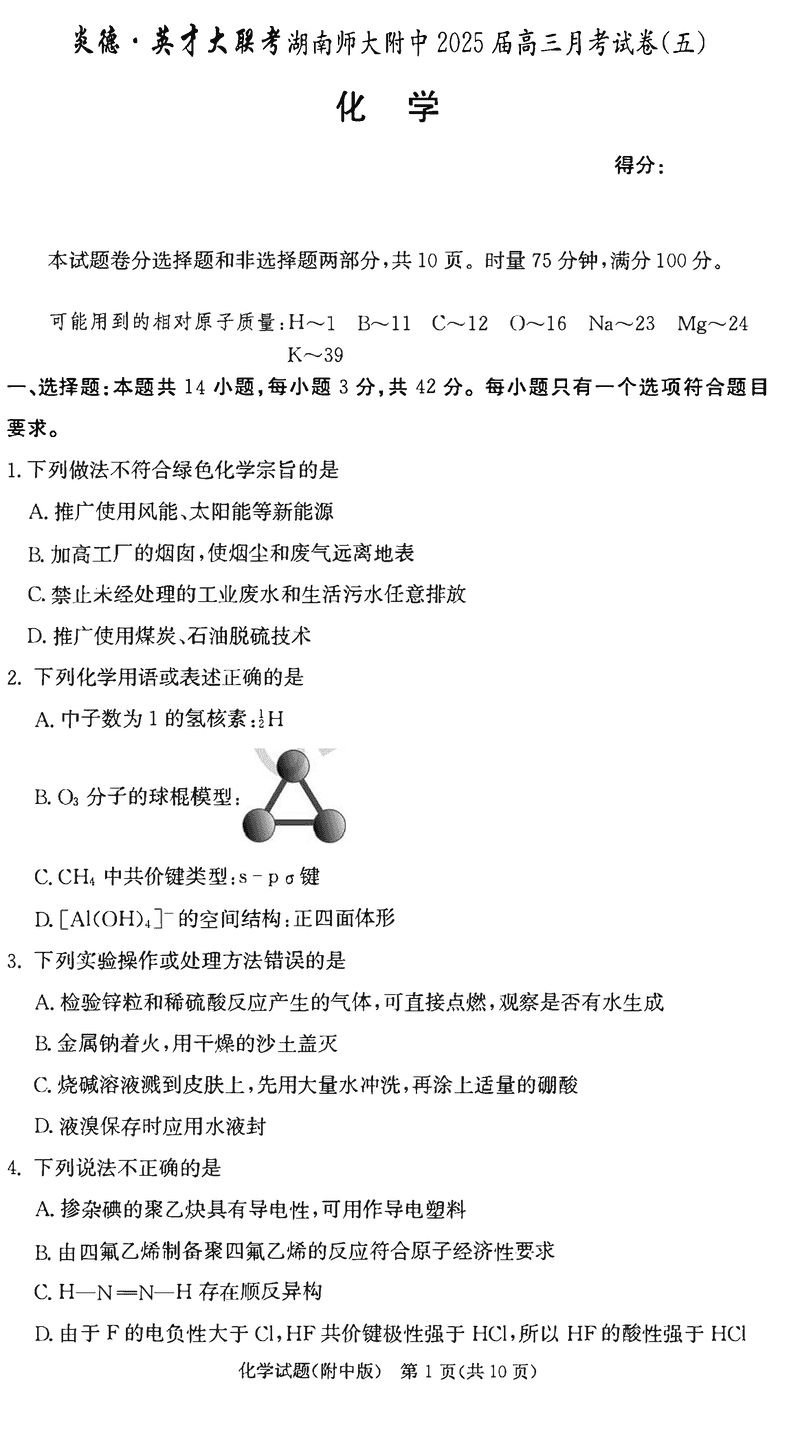 湖南师大附中2025届高三上学期月考(五)化学考试已于近日开考,为方便考生考后及时查看考试情况,查漏补缺、弥补不足,本文整理了试题答案解析相关信息!