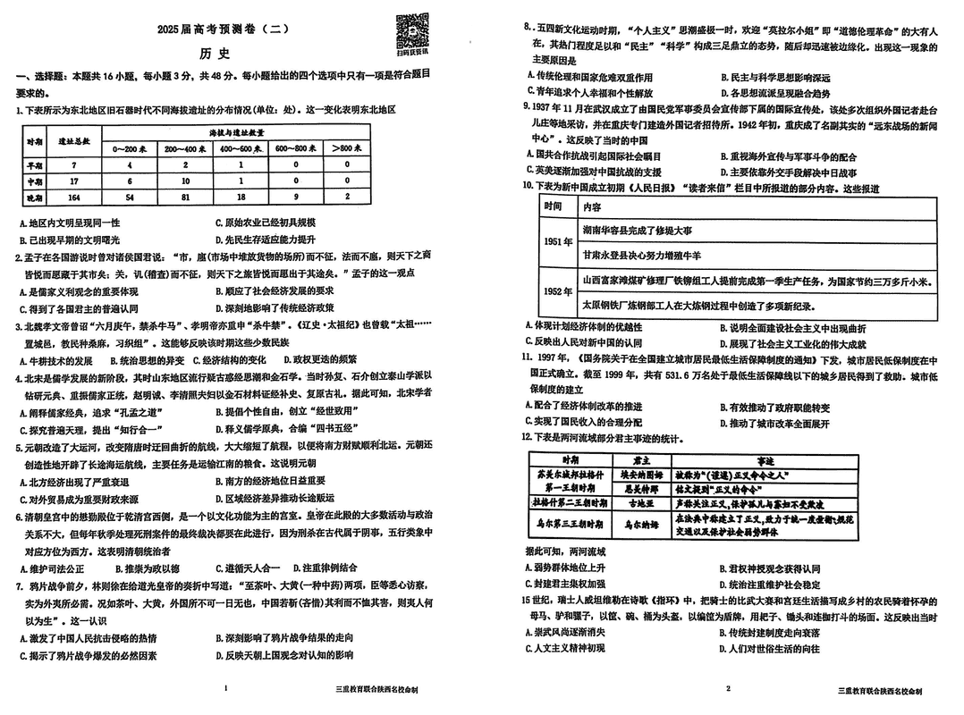 陕西省三重教育2025届高考预测卷(二)历史试题及答案
