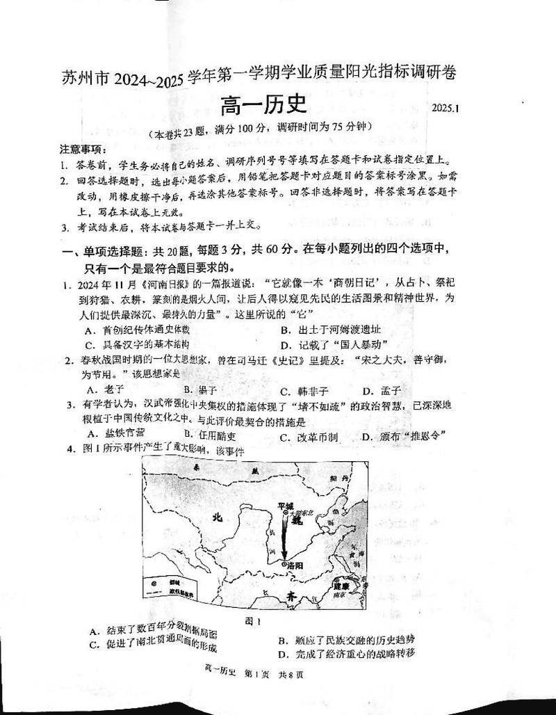 江苏省苏州市2024-2025学年高一上学期1月期末学业阳光指标调研历史考试已于近日开考,为方便考生考后及时查看考试情况,查漏补缺、弥补不足,本文整理了试题答案解析相关信息!