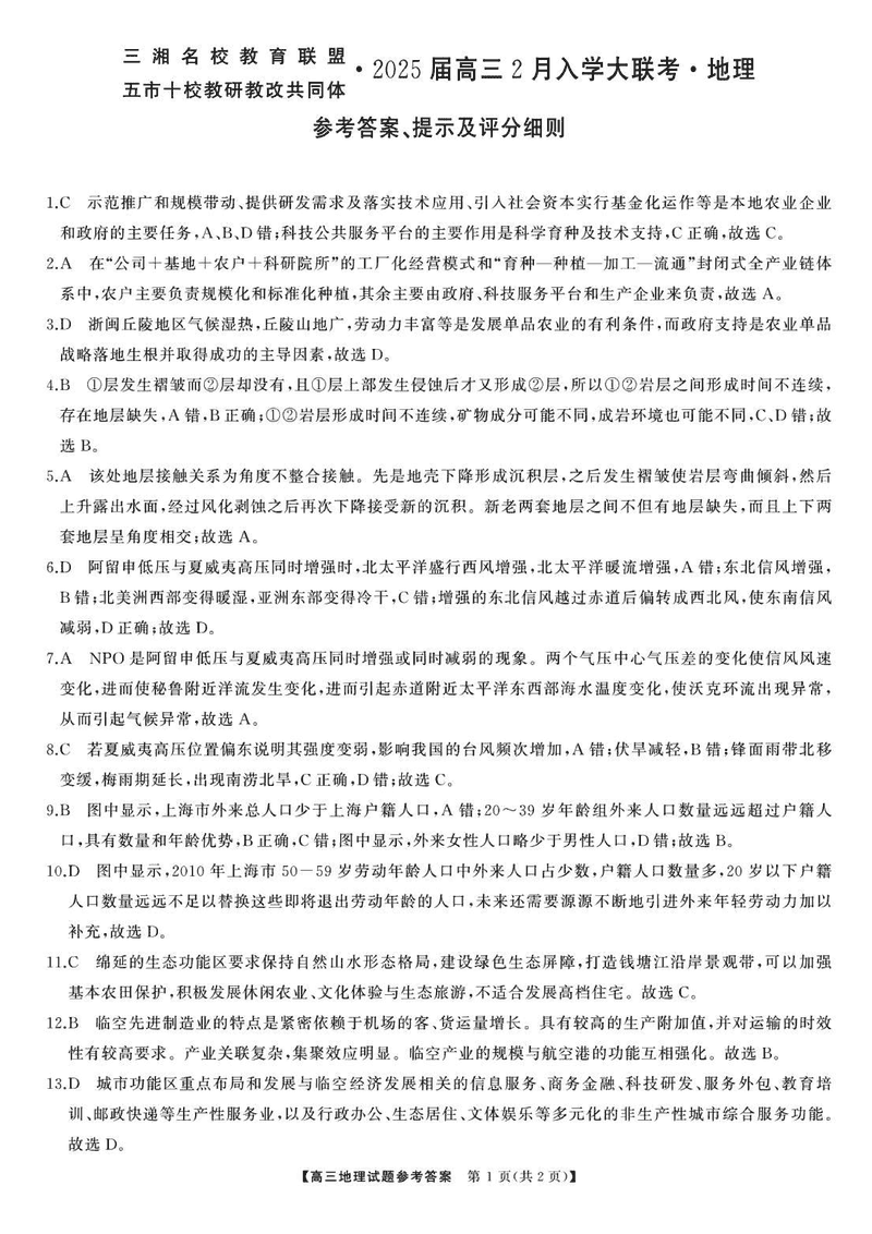 2025届三湘名校教育联盟五市十校教研教改共同体高三下2月入学大联考地理考试已于近日开考,为方便考生考后及时查看考试情况,查漏补缺、弥补不足,本文整理了试题答案解析相关信息!