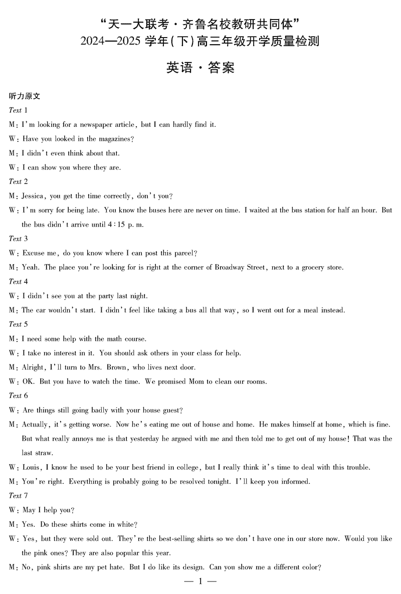 山东天一大联考齐鲁名校教研共同体2025年高三下开学质检英语考试已于近日开考,为方便考生考后及时查看考试情况,查漏补缺、弥补不足,本文整理了试题答案解析相关信息!