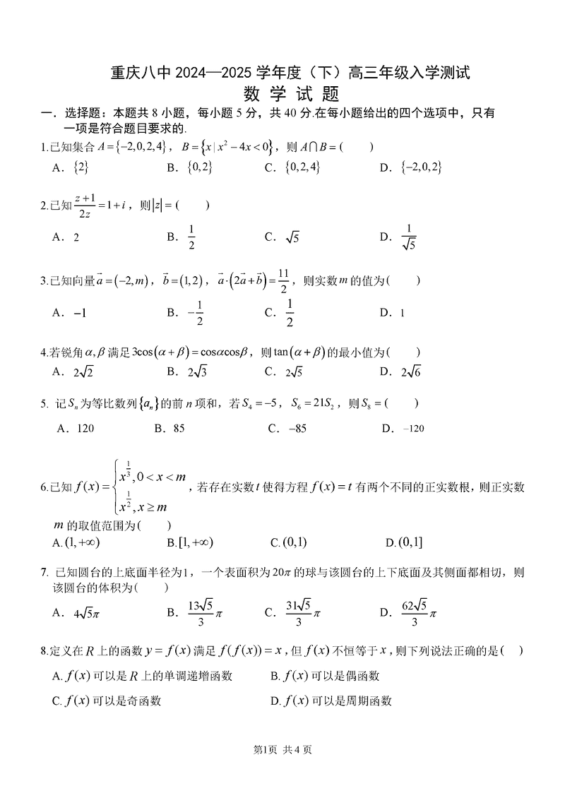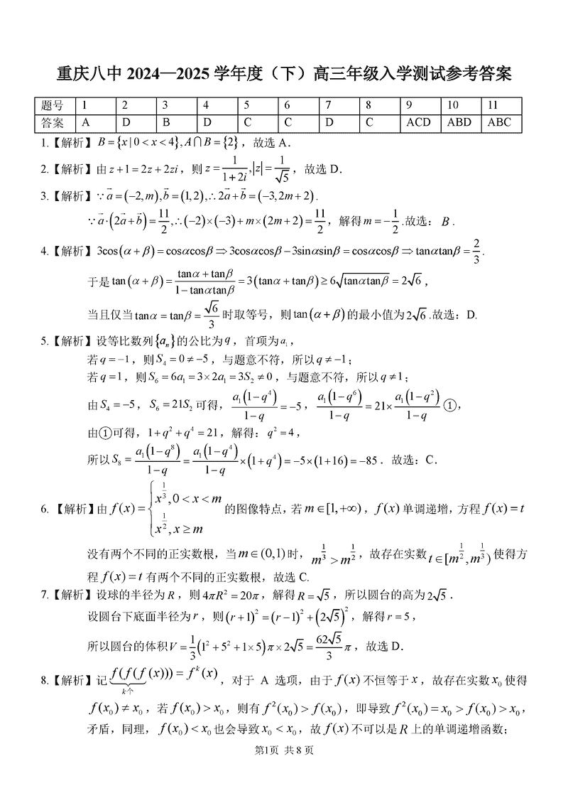 重庆八中2024-2025学年度高三下入学数学考试已于近日开考,为方便考生考后及时查看考试情况,查漏补缺、弥补不足,本文整理了试题答案解析相关信息!