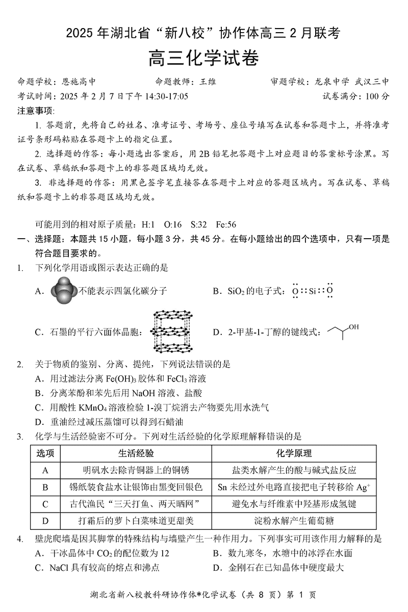 2025年湖北省新八校协作体高三2月联考化学试题及答案