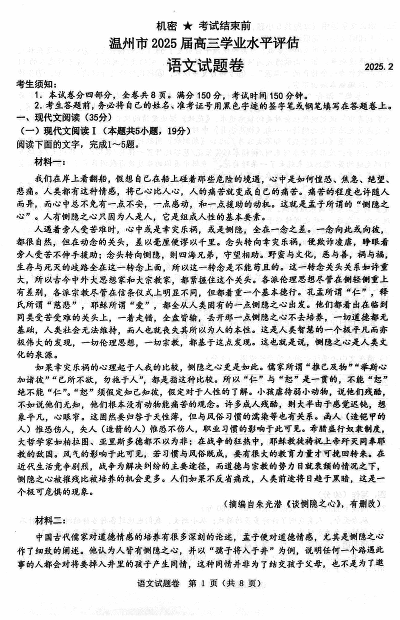 2025届浙江省温州市高三下学期学业水平评估语文试题及答案