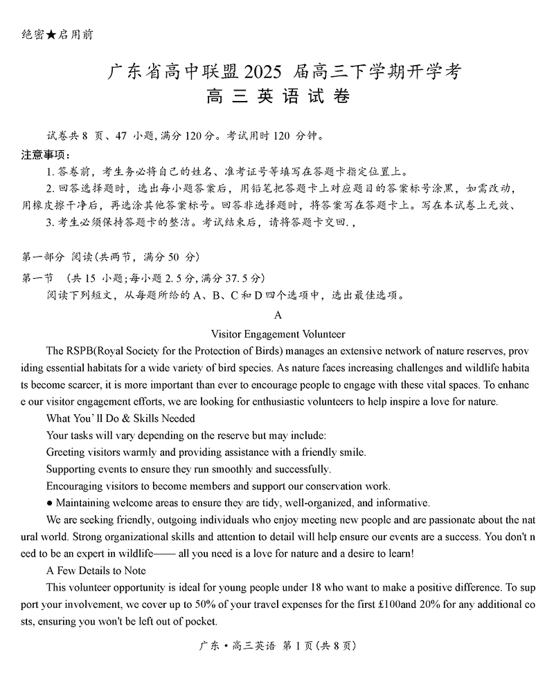 广东省领航高中联盟2025届高三下学期2月开学考英语试题及答案