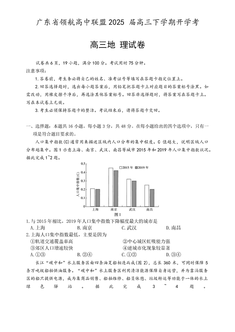 广东省领航高中联盟2025届高三下学期2月开学考地理试题及答案
