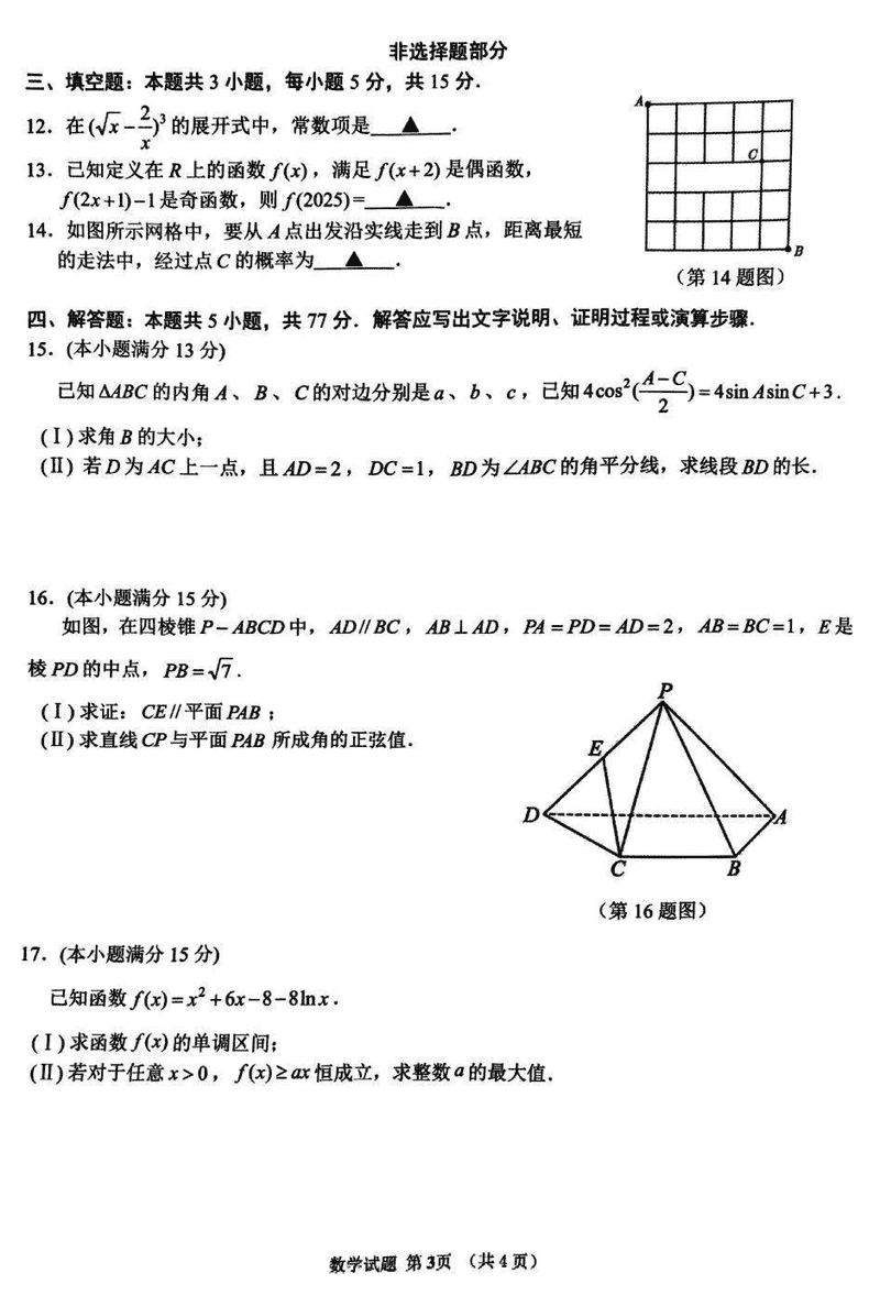 2025年2月浙江G12名校协作体高三返校考数学试题及答案