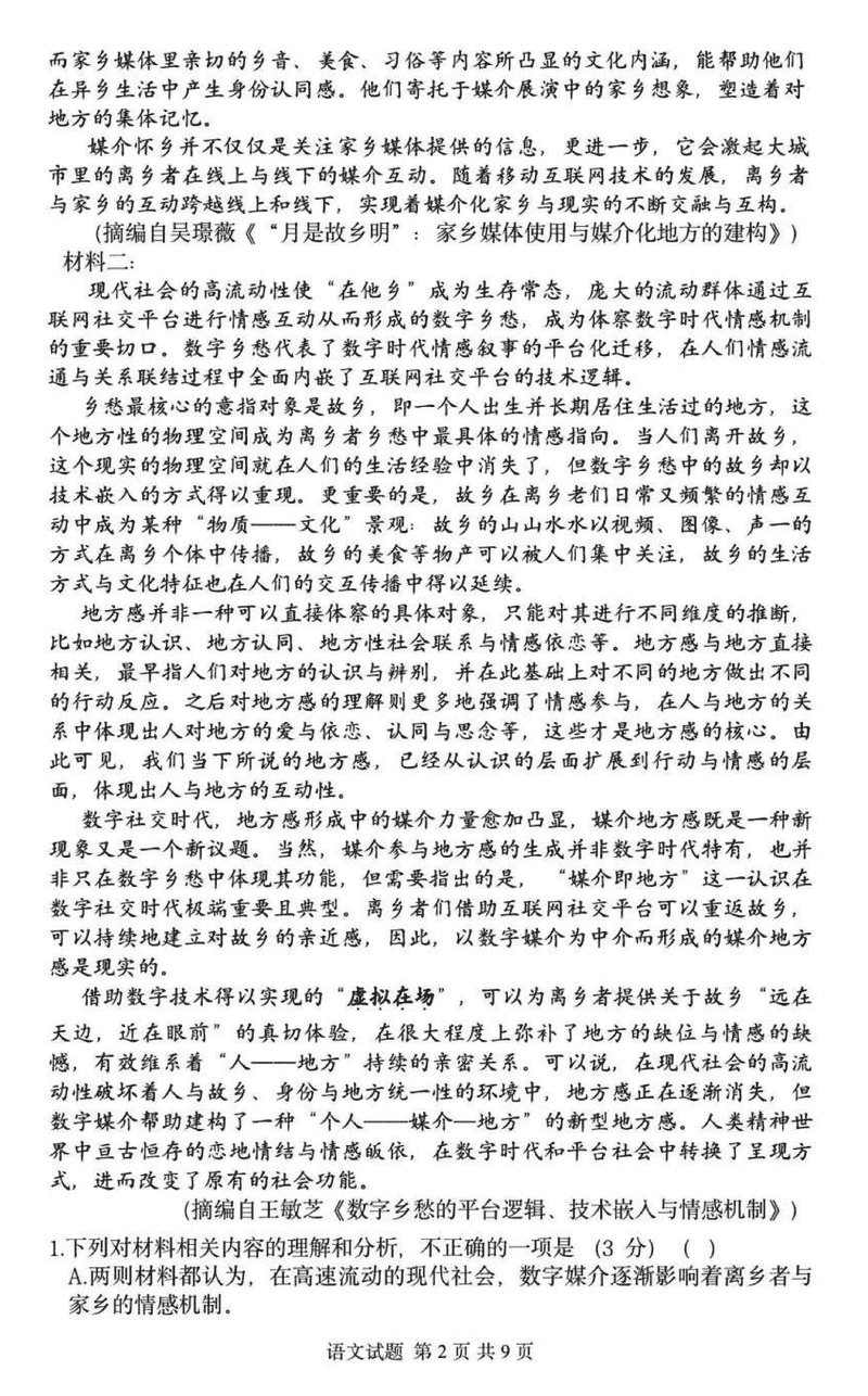 2025年2月浙江G12名校协作体高三返校考语文试题及答案