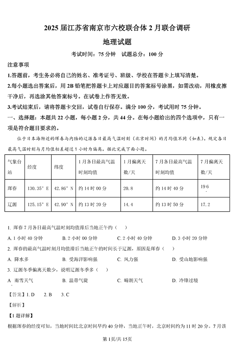 南京六校联合体2025届高三下学期2月调研地理考试已于近日开考,为方便考生考后及时查看考试情况,查漏补缺、弥补不足,本文整理了试题答案解析相关信息!