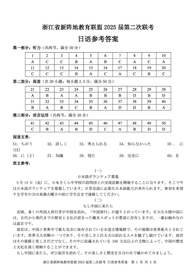浙江新阵地教育联盟2025届高三第二次联考日语考试已于近日开考,为方便考生考后及时查看考试情况,查漏补缺、弥补不足,本文整理了试题答案解析相关信息!