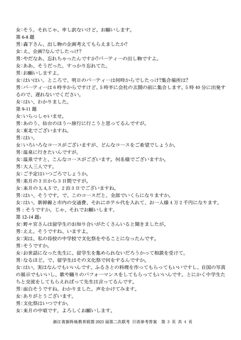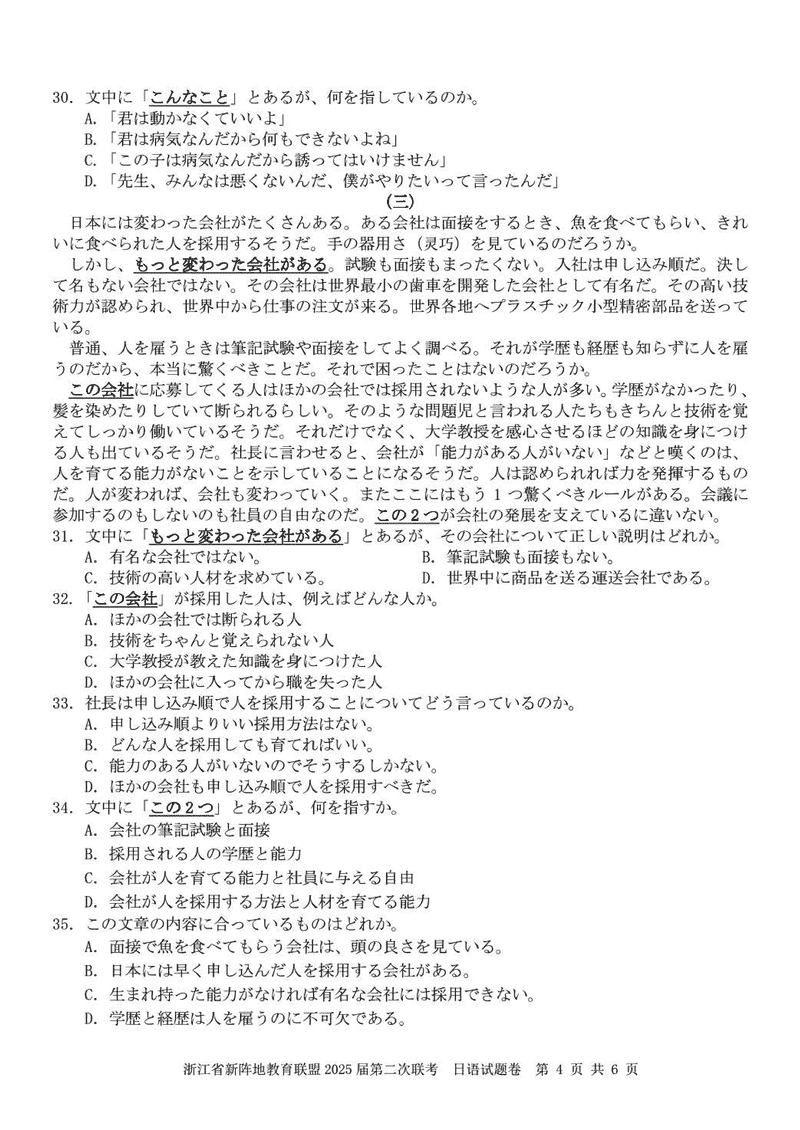 浙江新阵地教育联盟2025届高三第二次联考日语试题及答案