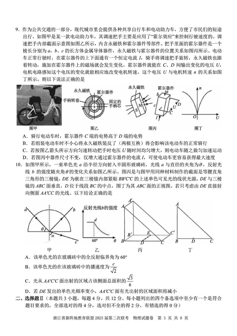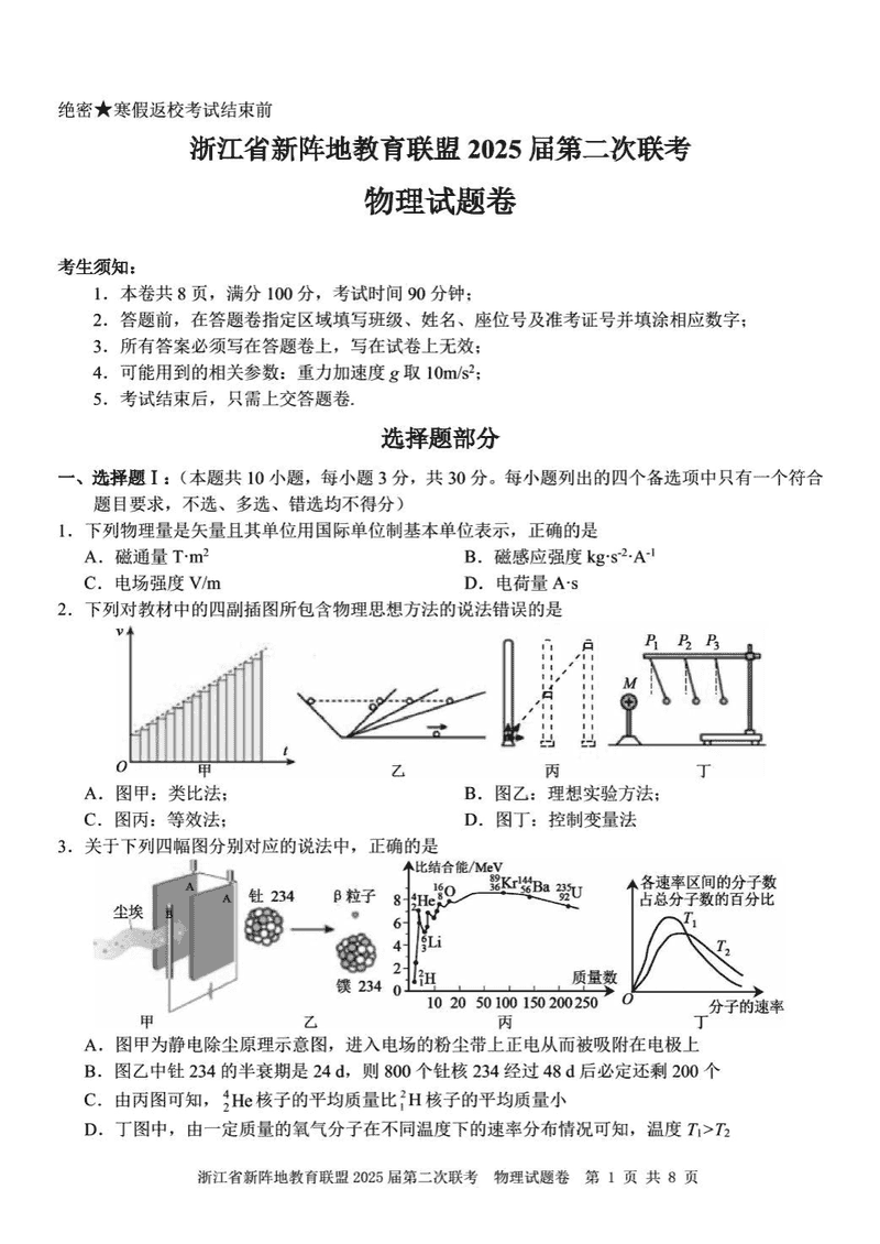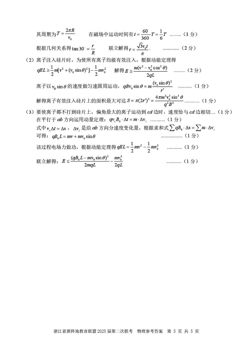 浙江新阵地教育联盟2025届高三第二次联考物理试题及答案