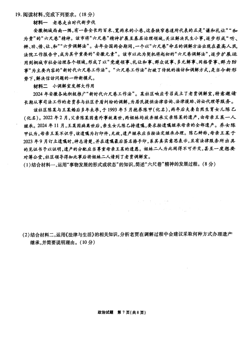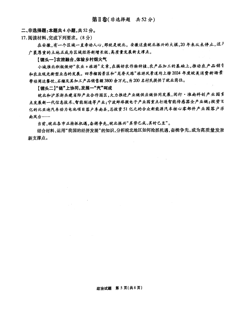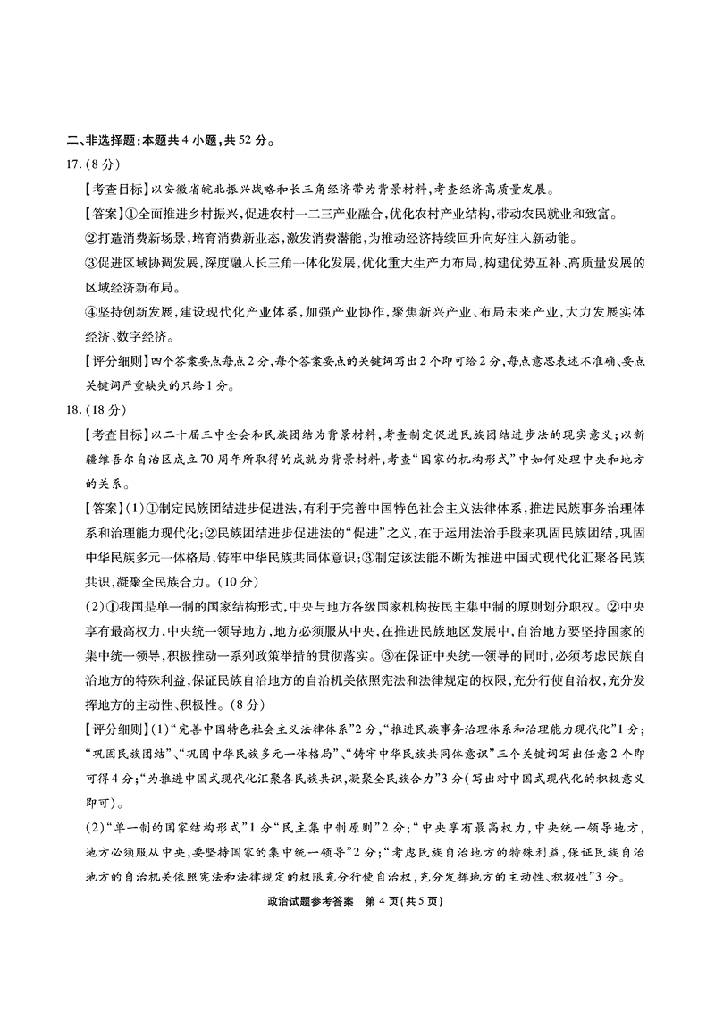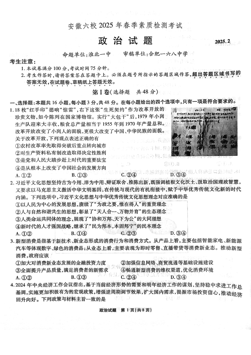 安徽六校2025年高三2月春季素质检测政治试题及答案