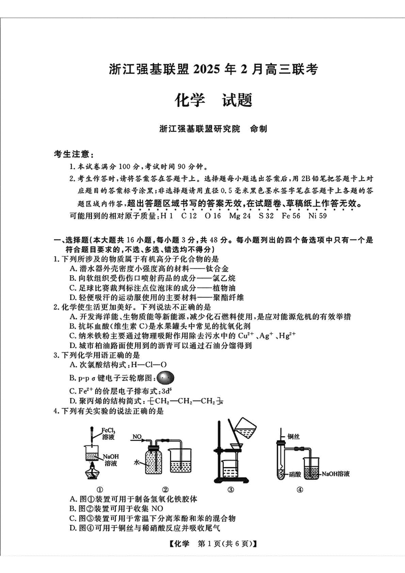 浙江强基联盟2025年2月高三下学期联考化学试题及答案