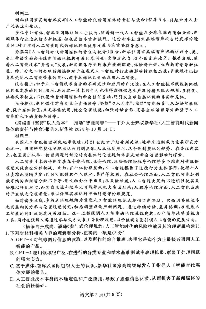 四川省2025届高三下学期第一次教学质量联合测评语文试题及答案