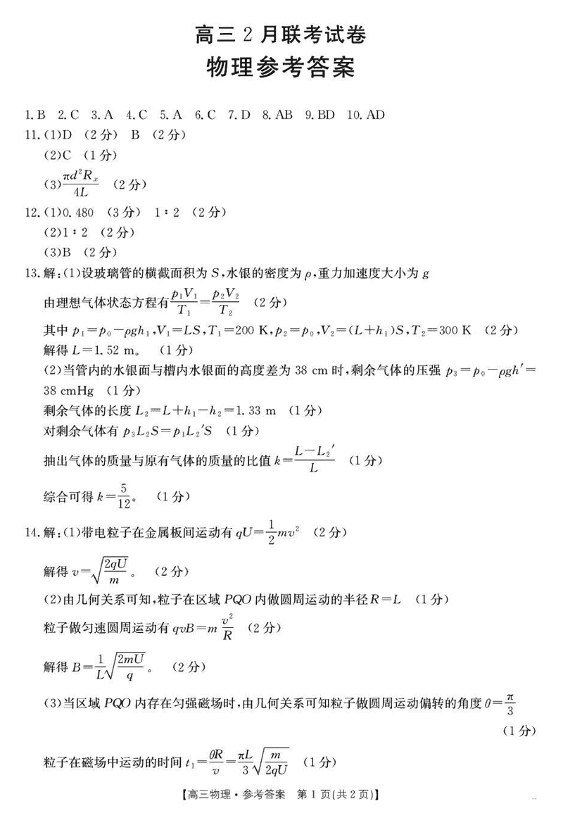 湖北鄂东新领先协作体2025届高三下学期2月联考物理试题及答案