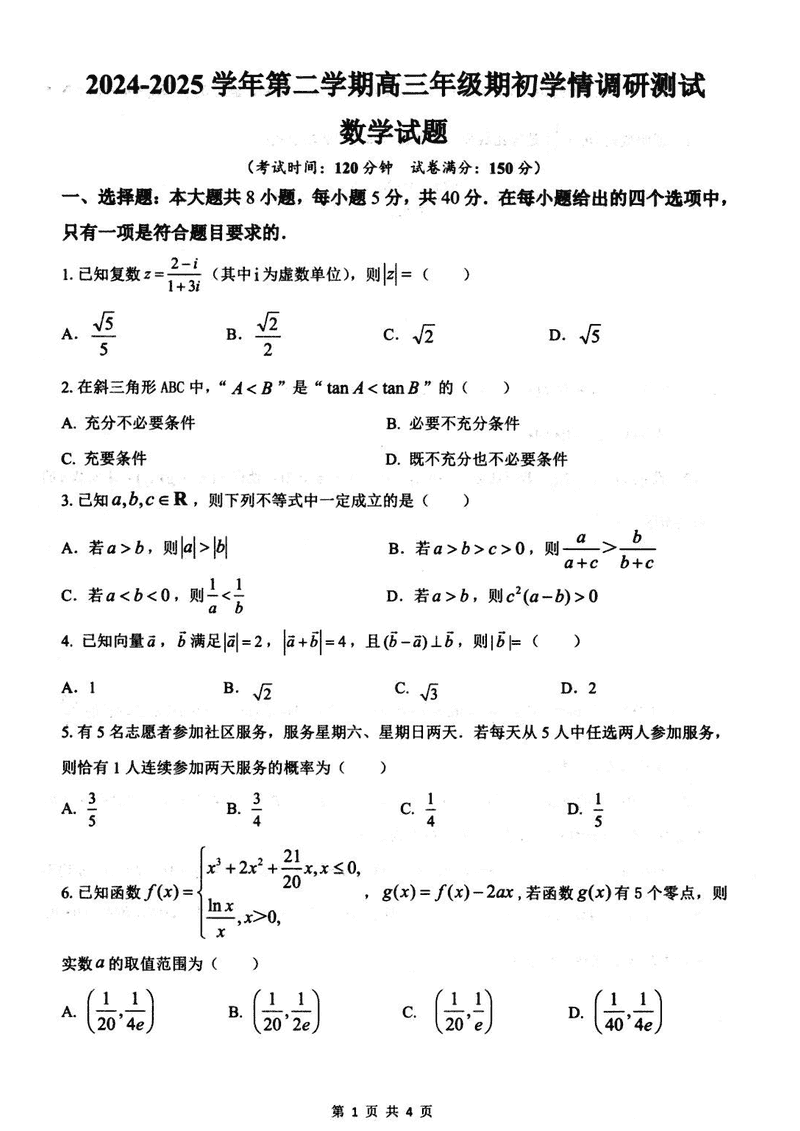 扬州高邮2025年高三下学期期初学情调研数学试题及答案 时间:2025-02-20 江苏 数学试题 扬州高邮2025年高三下学期期初学情调研数学考试已于近日开考,为方便考生考后及时查看考试情况,查漏补缺、弥补不足,本文整理了试题答案解析相关信息! 汇总:扬州高邮2025年高三下学期开学考试题及答案汇总 数学试题及答案解析