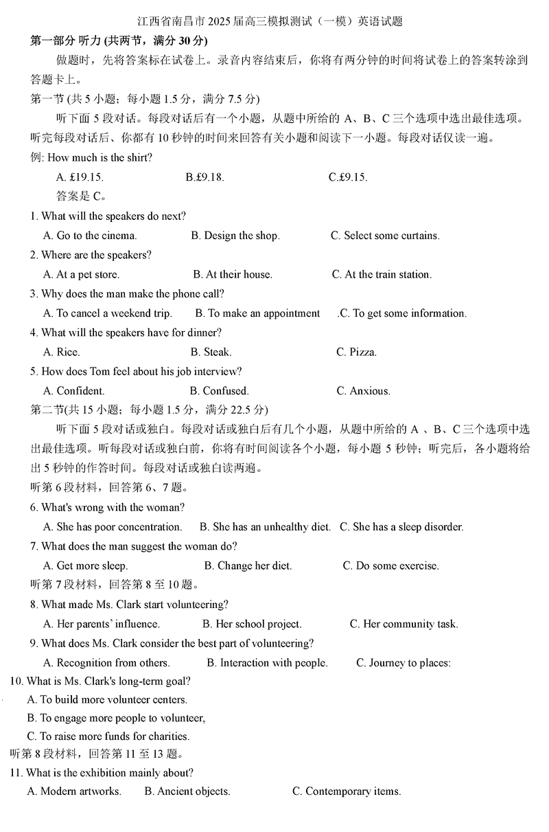 南昌一模暨南昌市2025届高三模拟测试英语试题及答案 时间:2025-02-23 英语试题 南昌一模暨南昌市2025届高三模拟测试英语考试已于近日开考,为方便考生考后及时查看考试情况,查漏补缺、弥补不足,本文整理了试题答案解析相关信息! 汇总:南昌一模暨南昌市2025届高三模拟测试试题及答案汇总 英语试题及答案解析