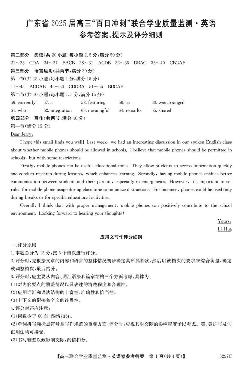 广东省2025届高三"百日冲刺"联合学业质量监测英语考试已于近日开考,为方便考生考后及时查看考试情况,查漏补缺、弥补不足,本文整理了试题答案解析相关信息!
