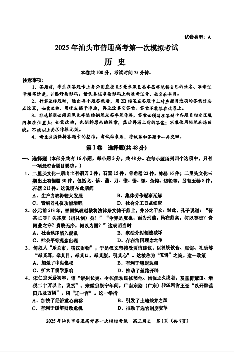 汕头一模2025届高三下学期第一次模拟考历史试题及答案
