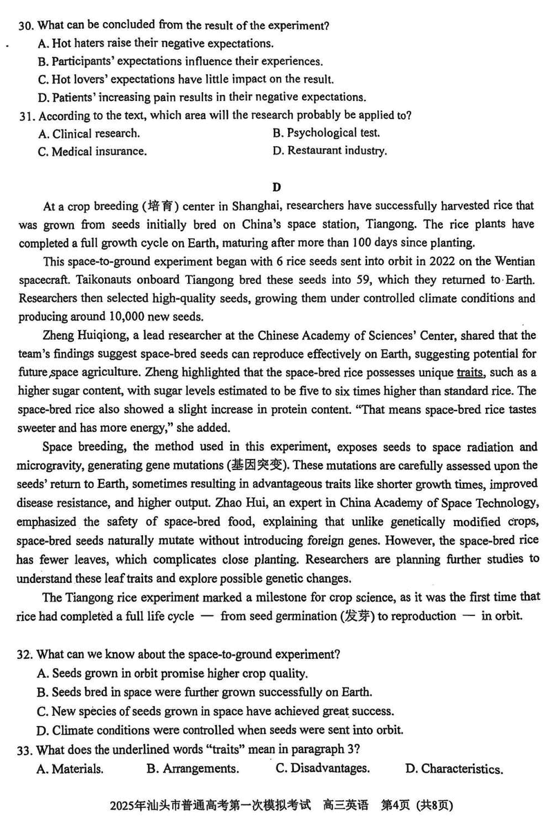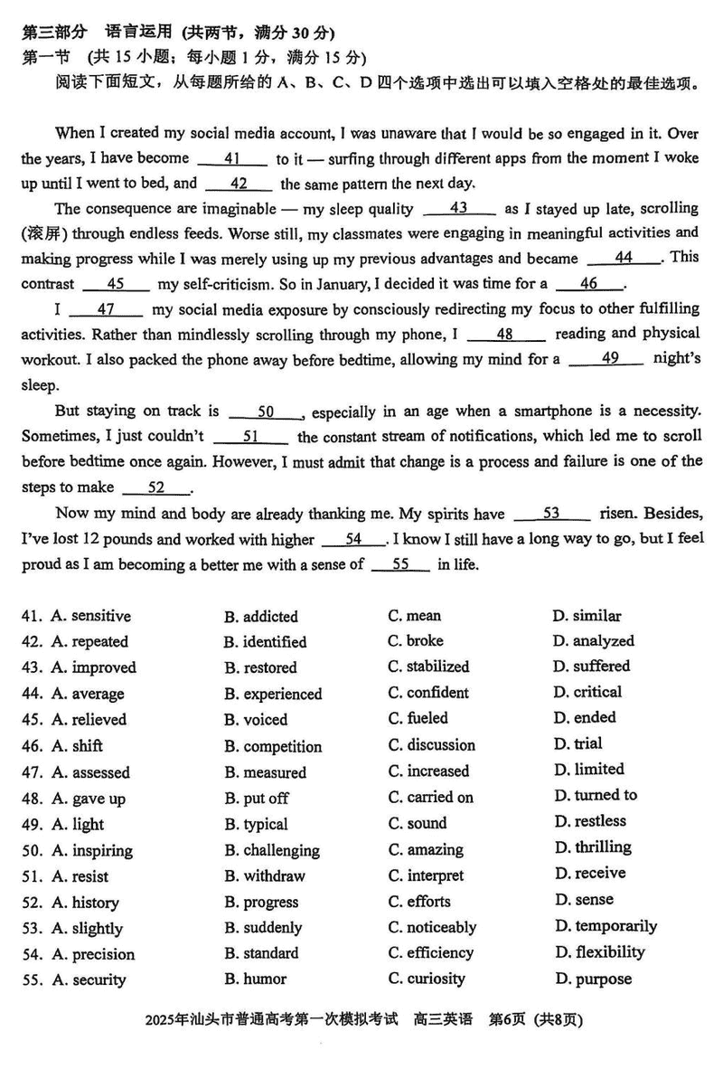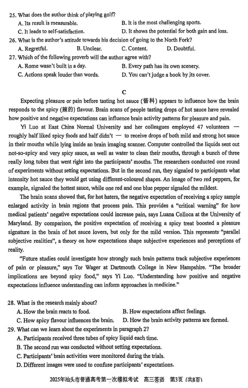 汕头一模2025届高三下学期第一次模拟考英语试题及答案