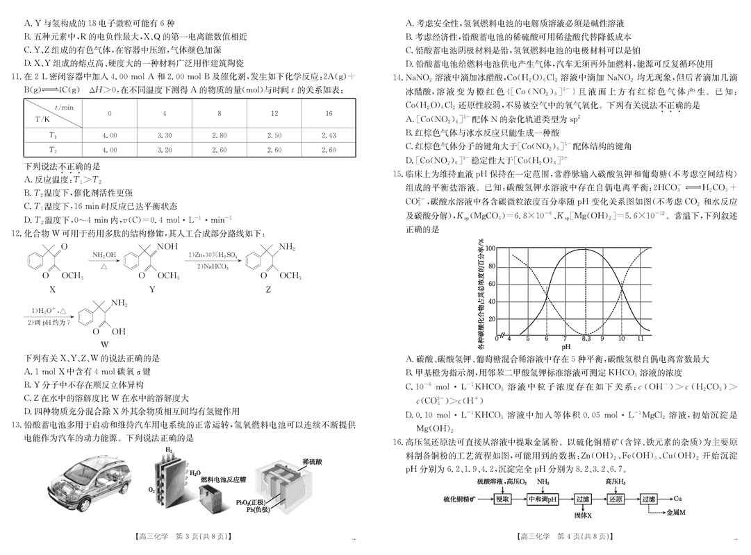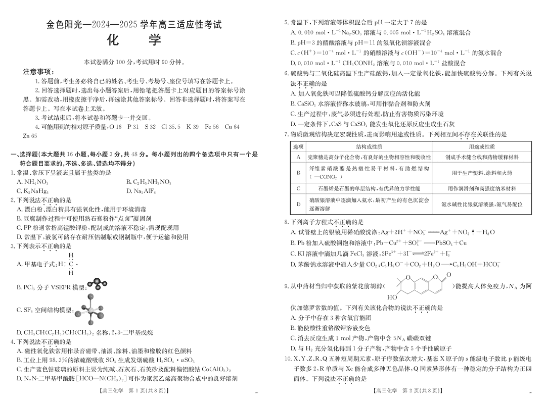 浙江金色阳光2024-2025学年高三下2月适应性化学试题及答案