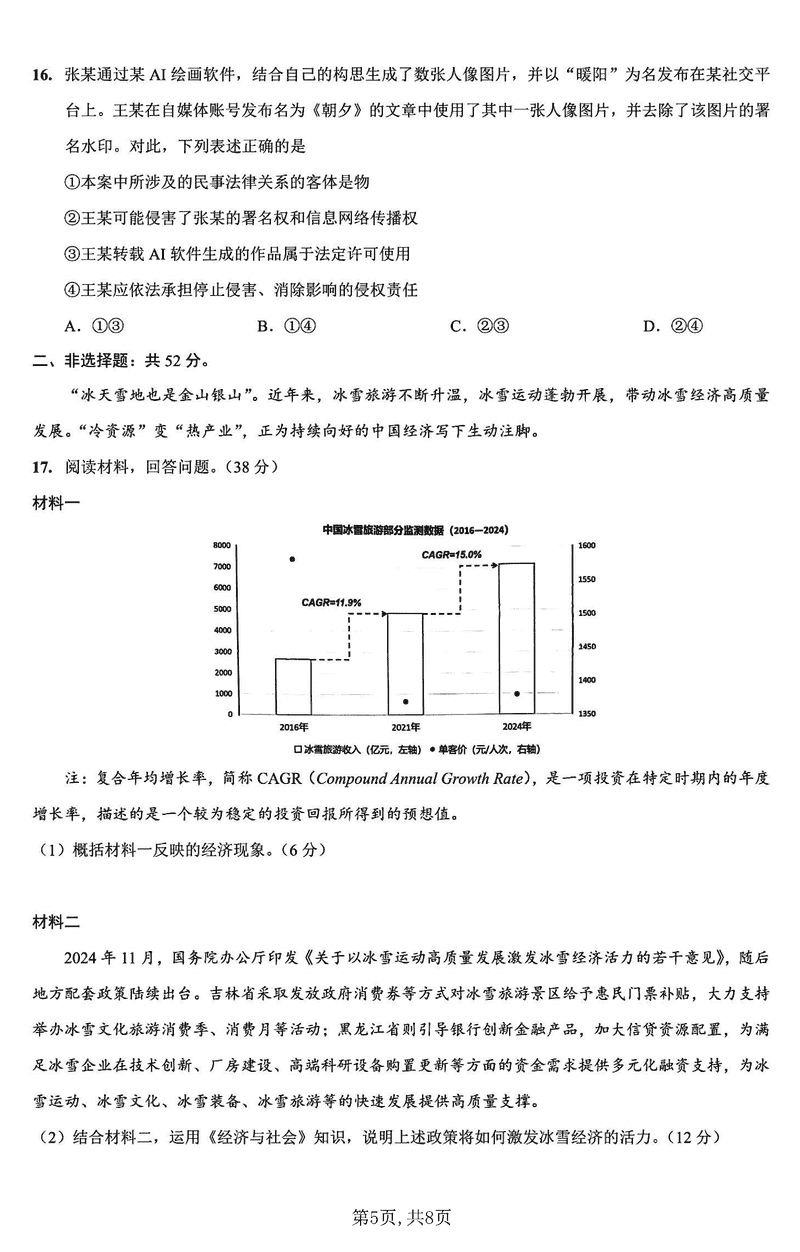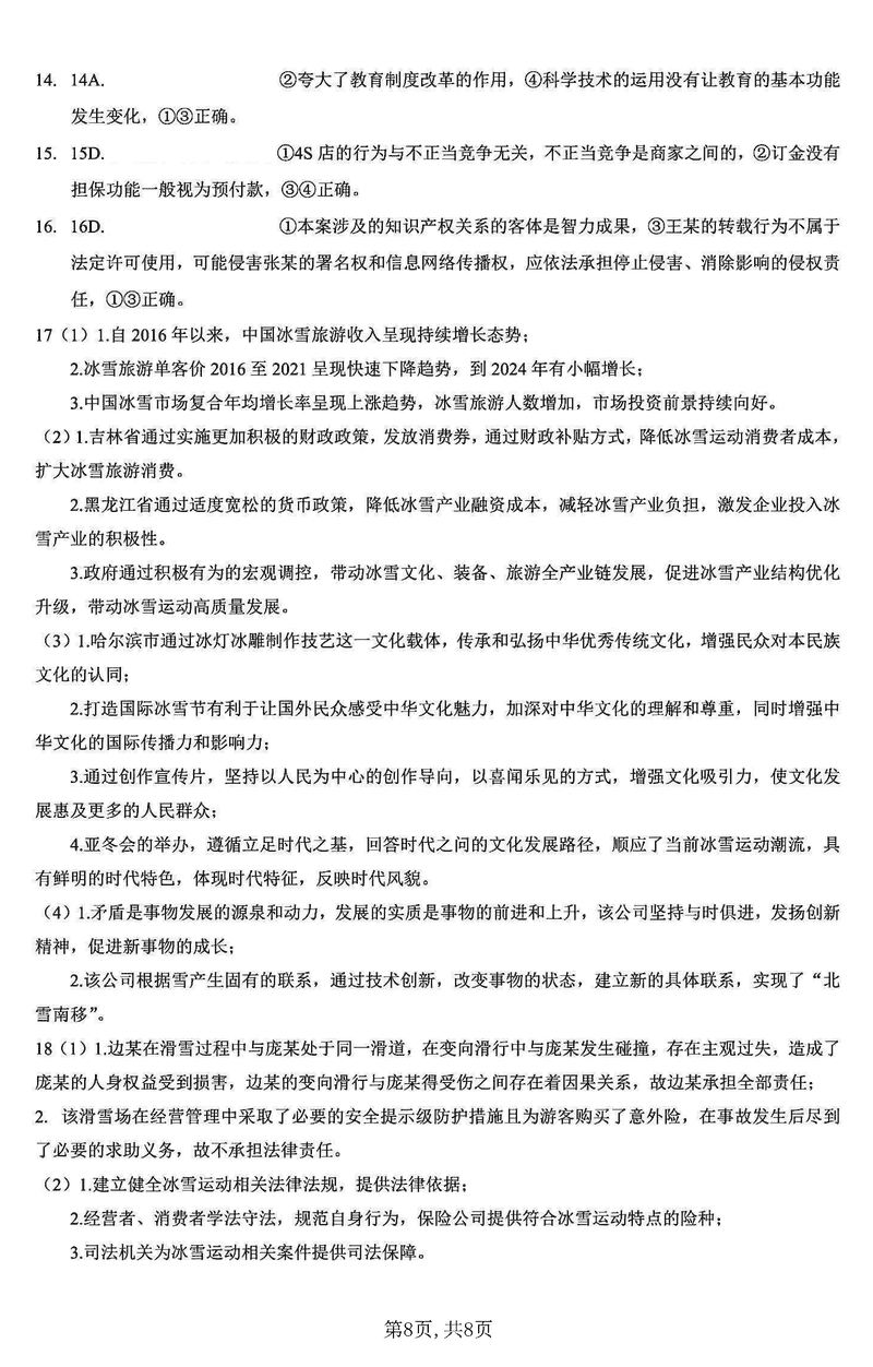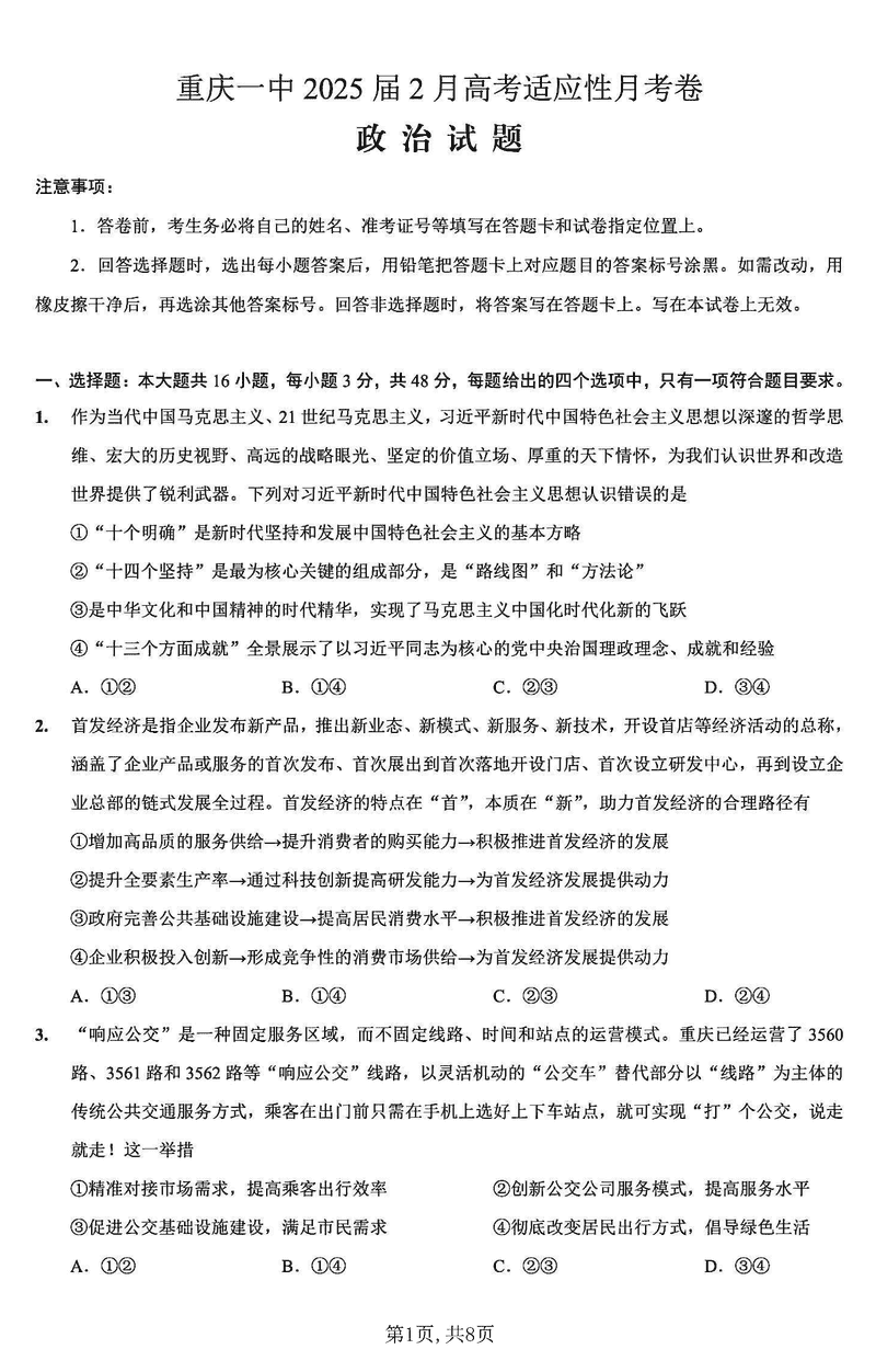 重庆一中2025届高三下学期2月开学考政治试题及答案