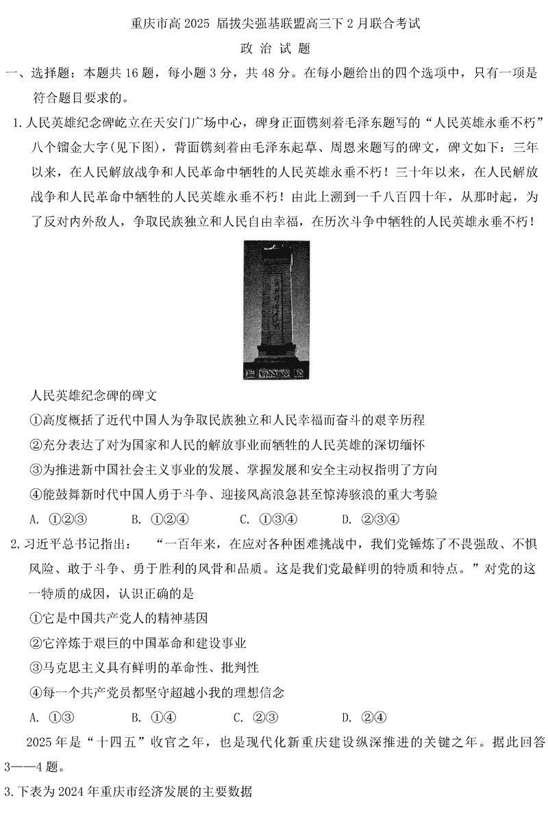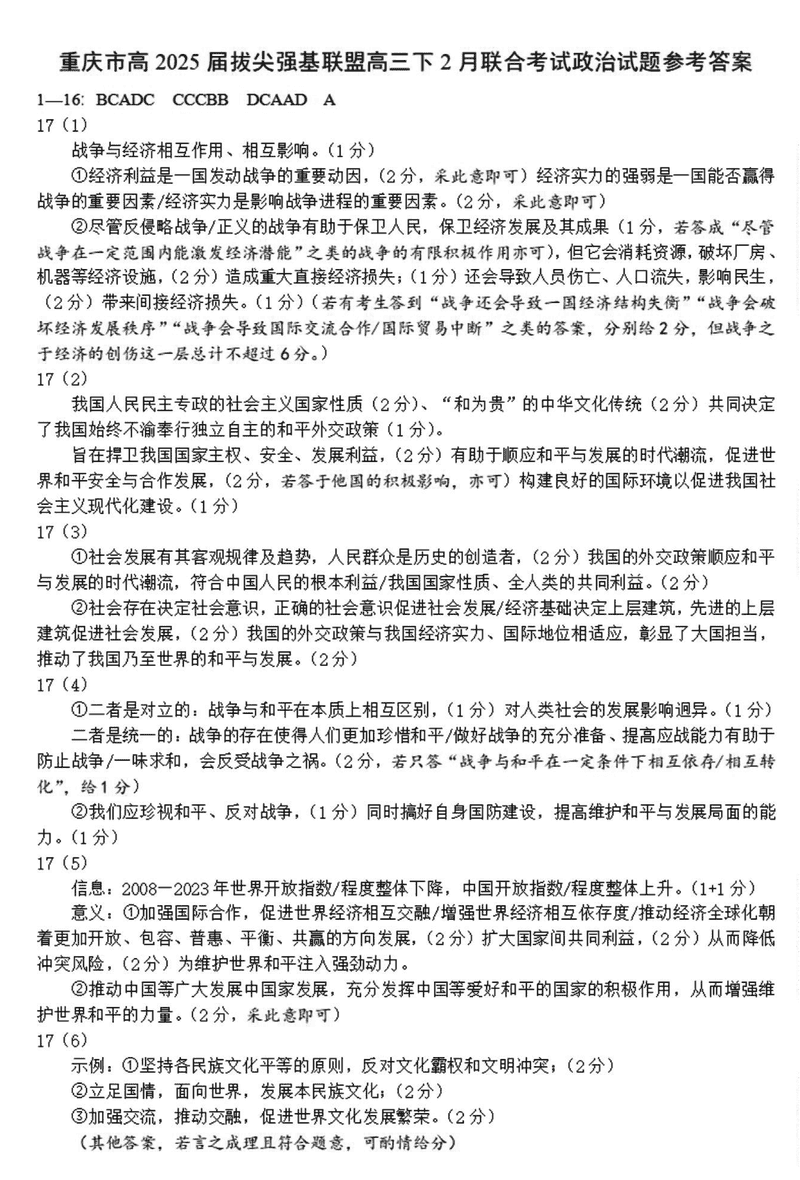 重庆市拔尖强基联盟2025届高三下2月联考政治考试已于近日开考,为方便考生考后及时查看考试情况,查漏补缺、弥补不足,本文整理了试题答案解析相关信息!