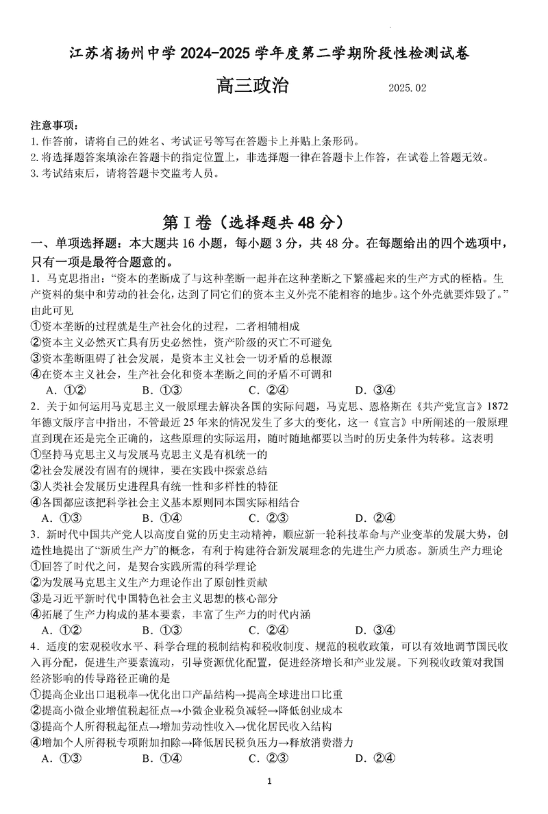 扬州中学2024-2025学年高三下学期2月阶段月考政治试题及答案