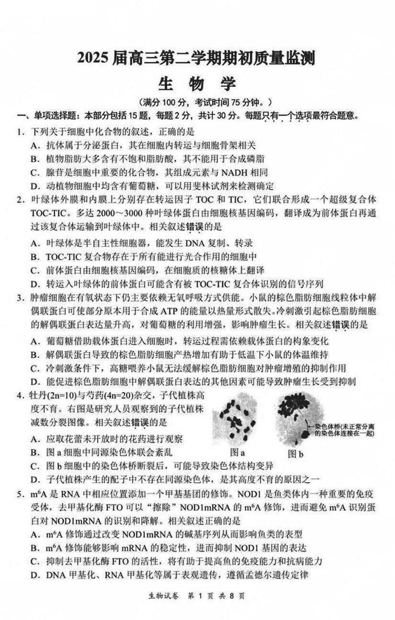 江苏省新高考基地学校2025届高三下学期期初质量监测生物考试已于近日开考,为方便考生考后及时查看考试情况,查漏补缺、弥补不足,本文整理了试题答案解析相关信息!