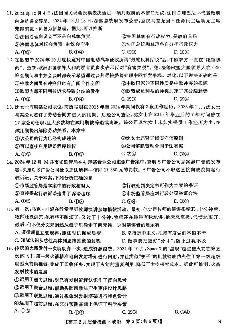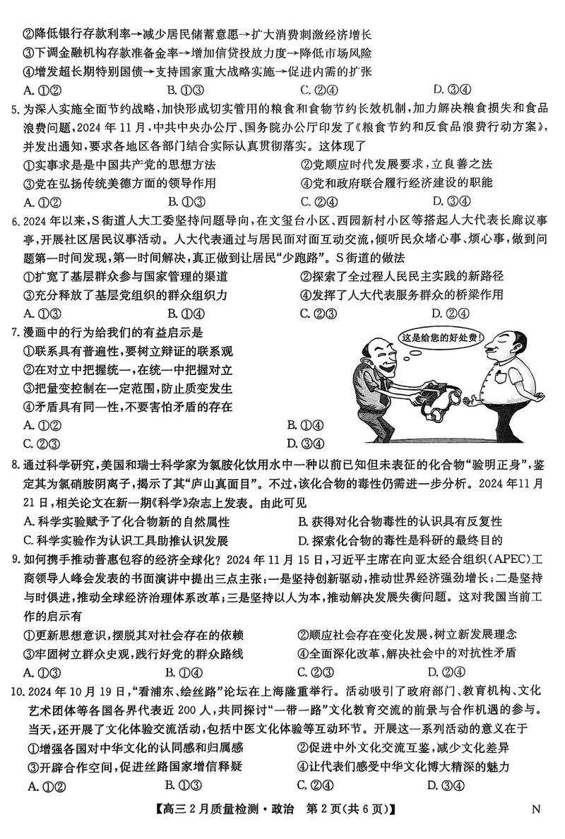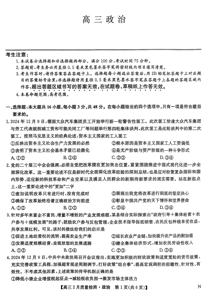 九师联盟2025届高三2月质量检测政治试题及答案 时间:2025-03-01 文综试题 九师联盟2025届高三2月质量检测政治考试已于近日开考,为方便考生考后及时查看考试情况,查漏补缺、弥补不足,本文整理了试题答案解析相关信息! 汇总:九师联盟2025届高三2月质量检测试题及答案汇总 政治试题及答案解析