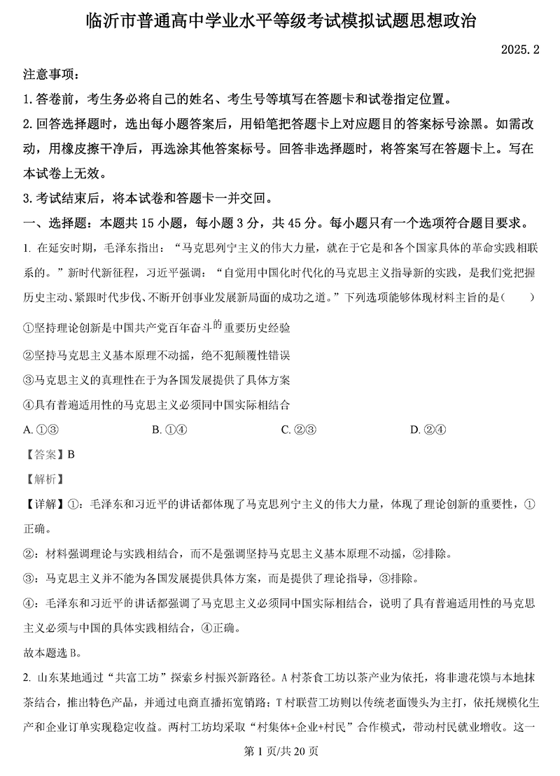 山东临沂2025届高三一模政治试题及答案 时间:2025-03-02 山东 文综试题 山东临沂2025届高三一模政治考试已于近日开考,为方便考生考后及时查看考试情况,查漏补缺、弥补不足,本文整理了试题答案解析相关信息! 汇总:山东临沂2025届高三一模试题及答案汇总 政治试题及答案解析