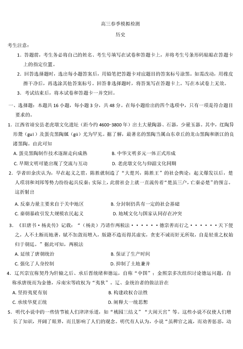 2025届河南省天一大联考高三3月春季模拟检测历史试题及答案