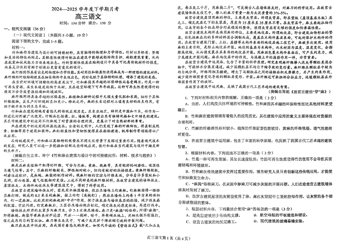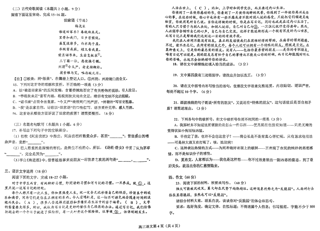 鞍山市2024-2025学年高三下学期第一次月考语文试题及答案