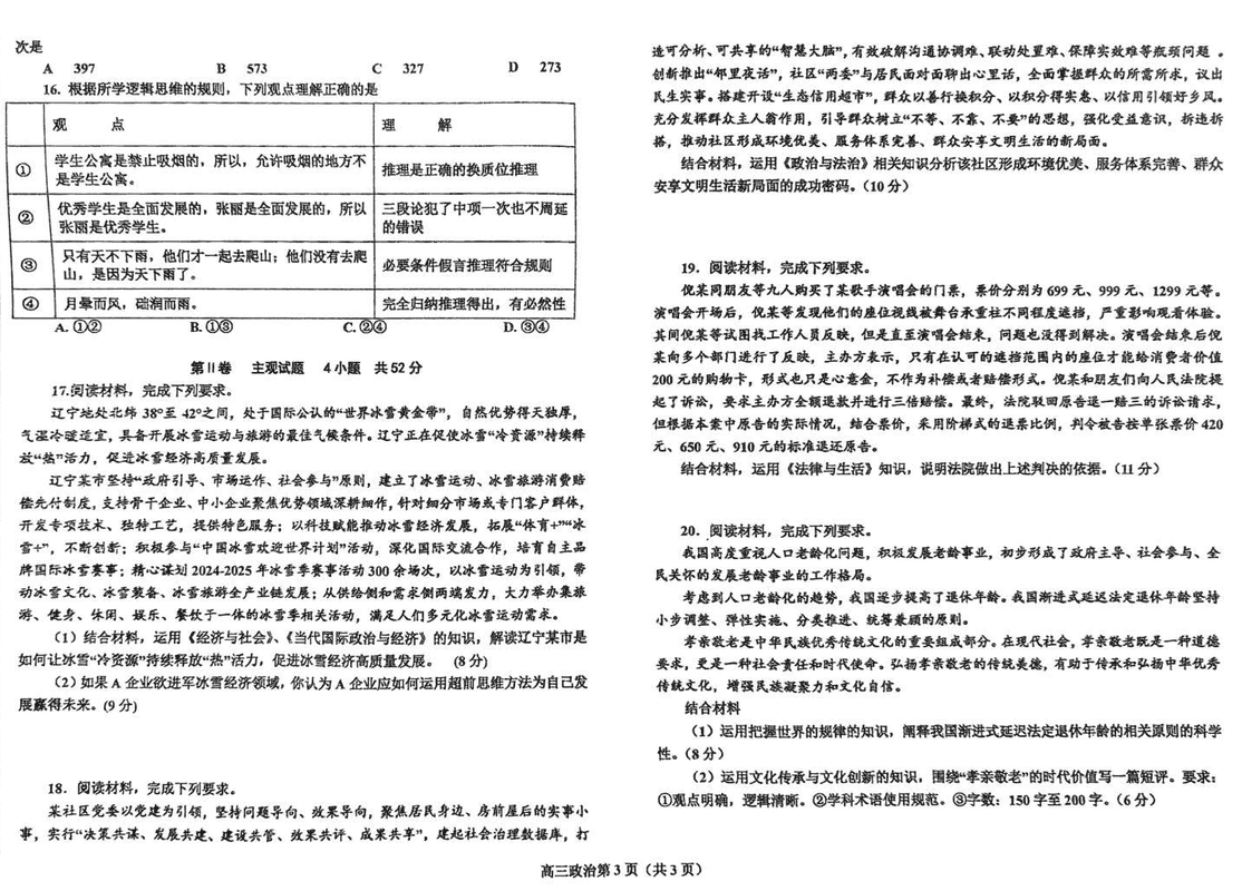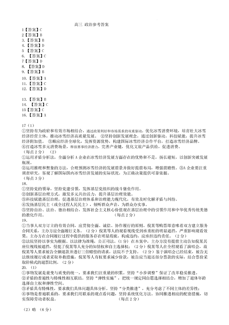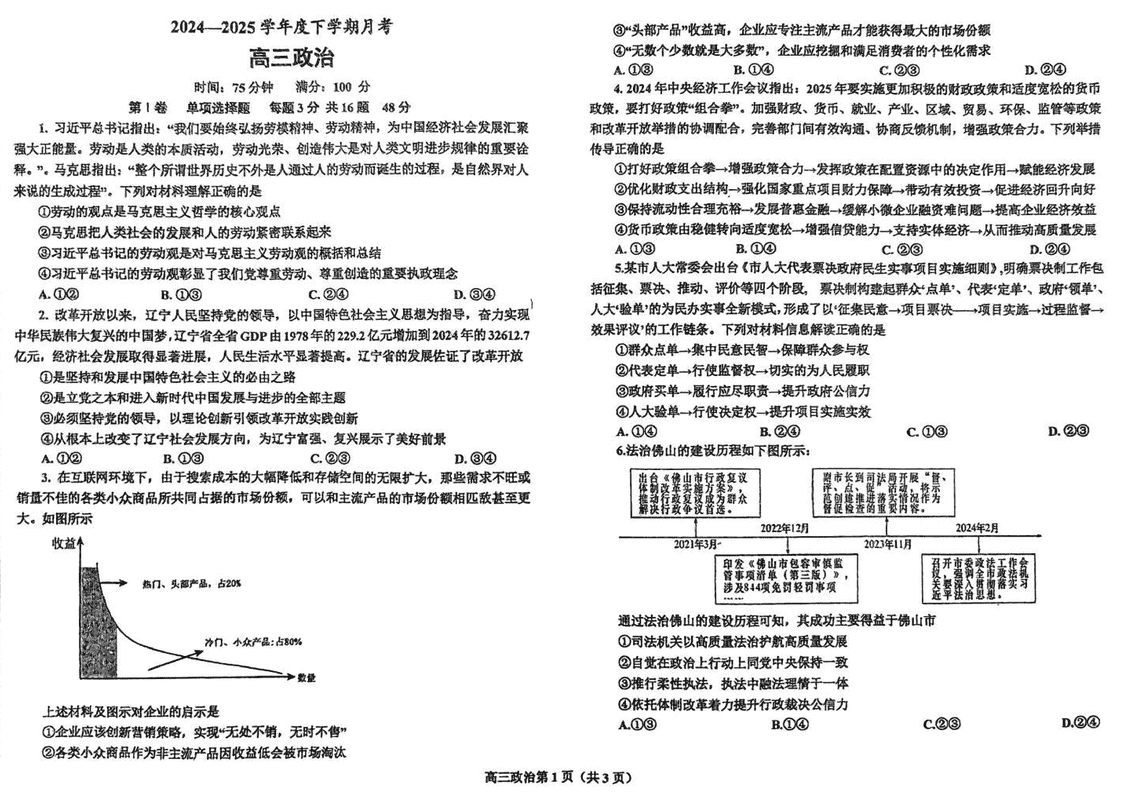鞍山市2024-2025学年高三下学期第一次月考政治试题及答案