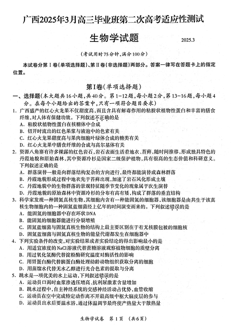 广西2025年3月高三第二次高考适应性测生物考试已于近日开考,为方便考生考后及时查看考试情况,查漏补缺、弥补不足,本文整理了试题答案解析相关信息!