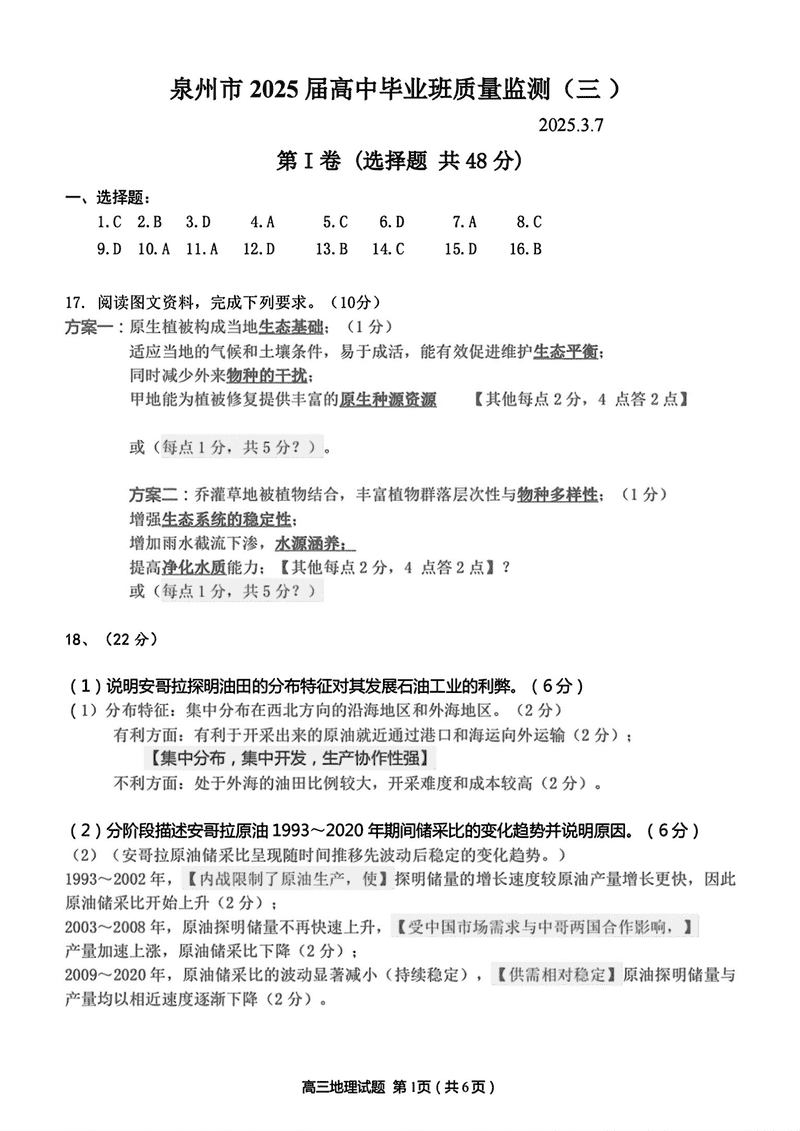 福建泉州2025届高中毕业班质量监测(三)地理考试已于近日开考,为方便考生考后及时查看考试情况,查漏补缺、弥补不足,本文整理了试题答案解析相关信息!