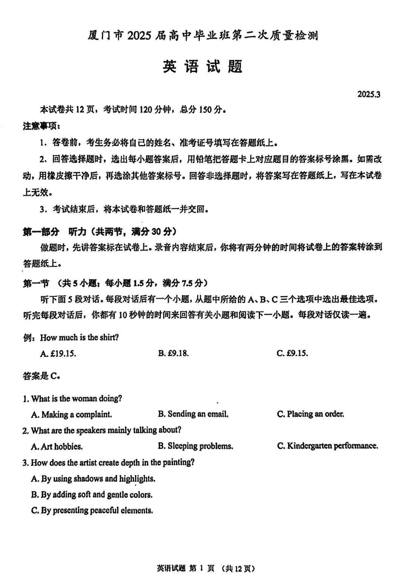 福建厦门2025届高三第二次质检英语考试已于近日开考,为方便考生考后及时查看考试情况,查漏补缺、弥补不足,本文整理了试题答案解析相关信息!