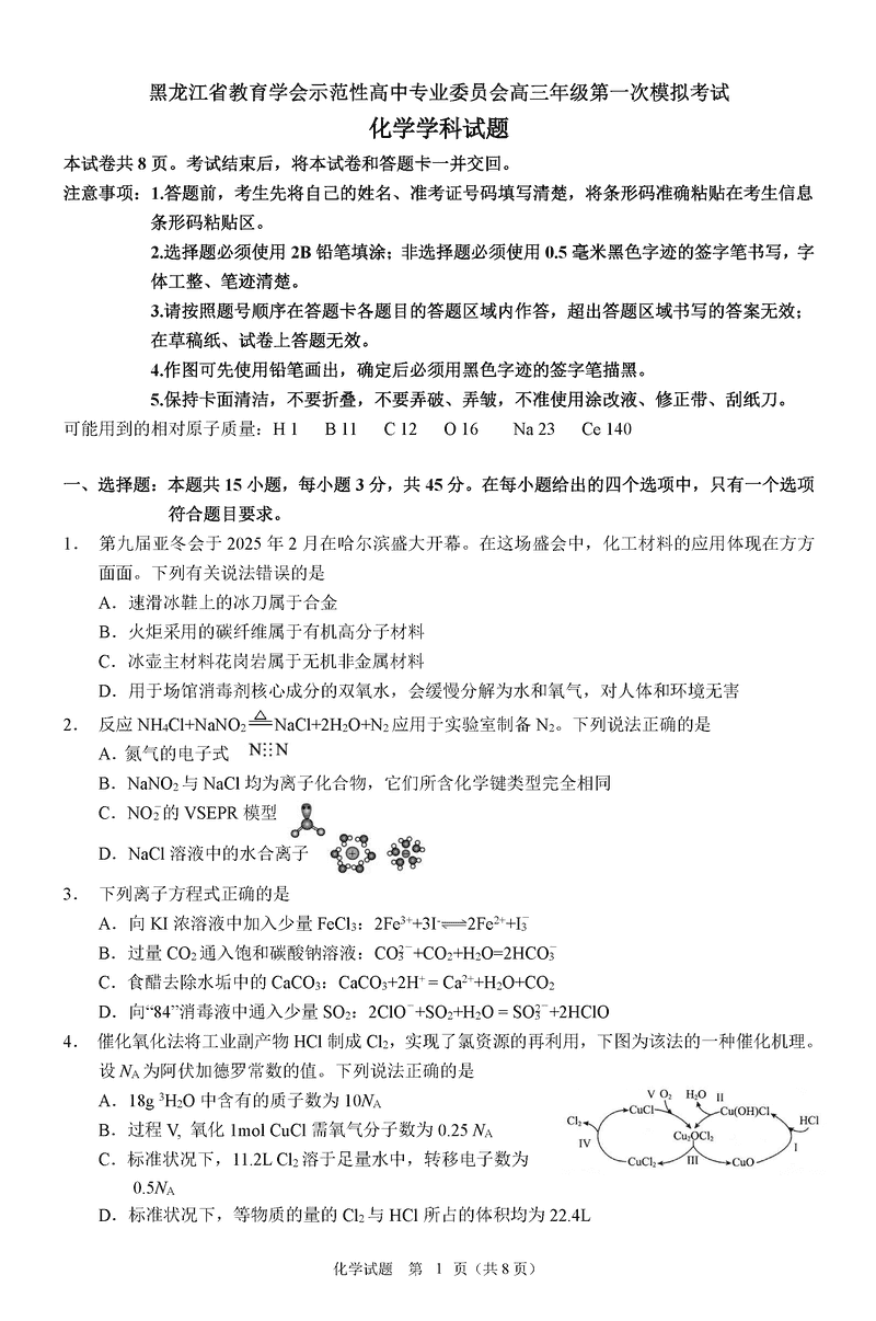 黑龙江教育学会示范性高中专业委员会2025高三第一次模考化学试题及答案