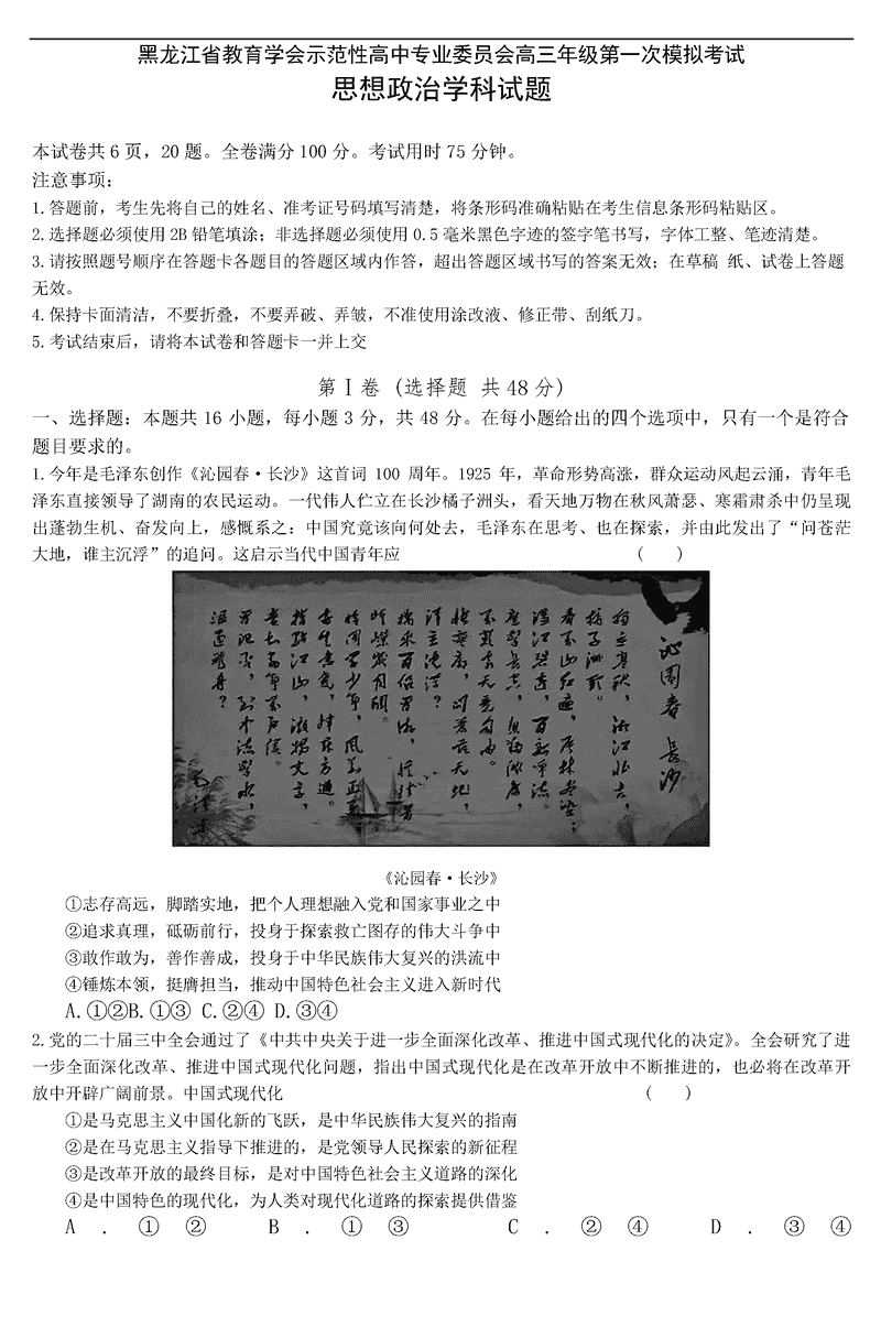 黑龙江教育学会示范性高中专业委员会2025高三第一次模考政治考试已于近日开考,为方便考生考后及时查看考试情况,查漏补缺、弥补不足,本文整理了试题答案解析相关信息!