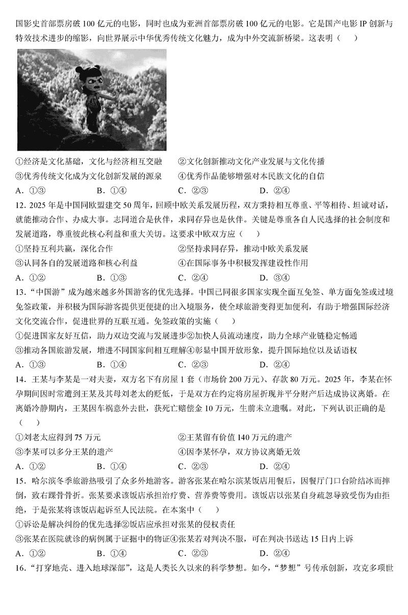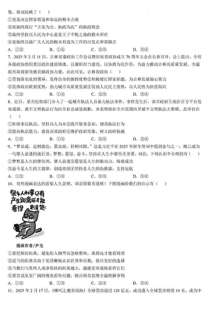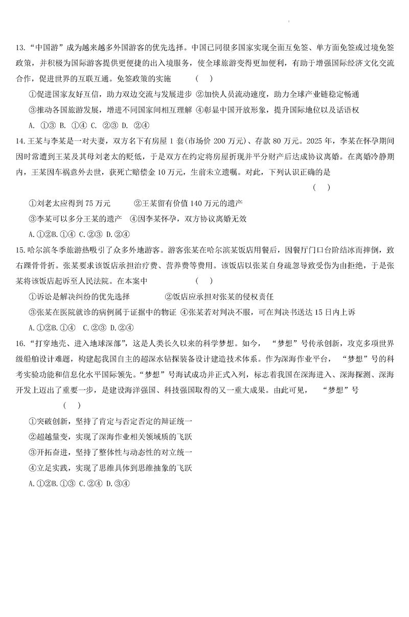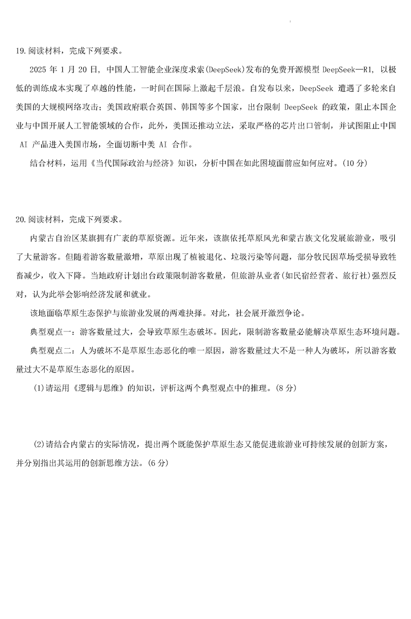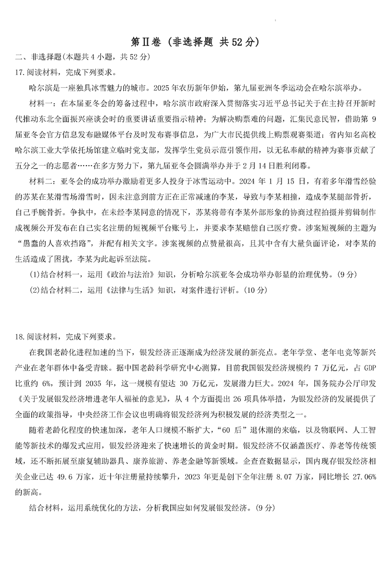 黑龙江教育学会示范性高中专业委员会2025高三第一次模考政治试题及答案