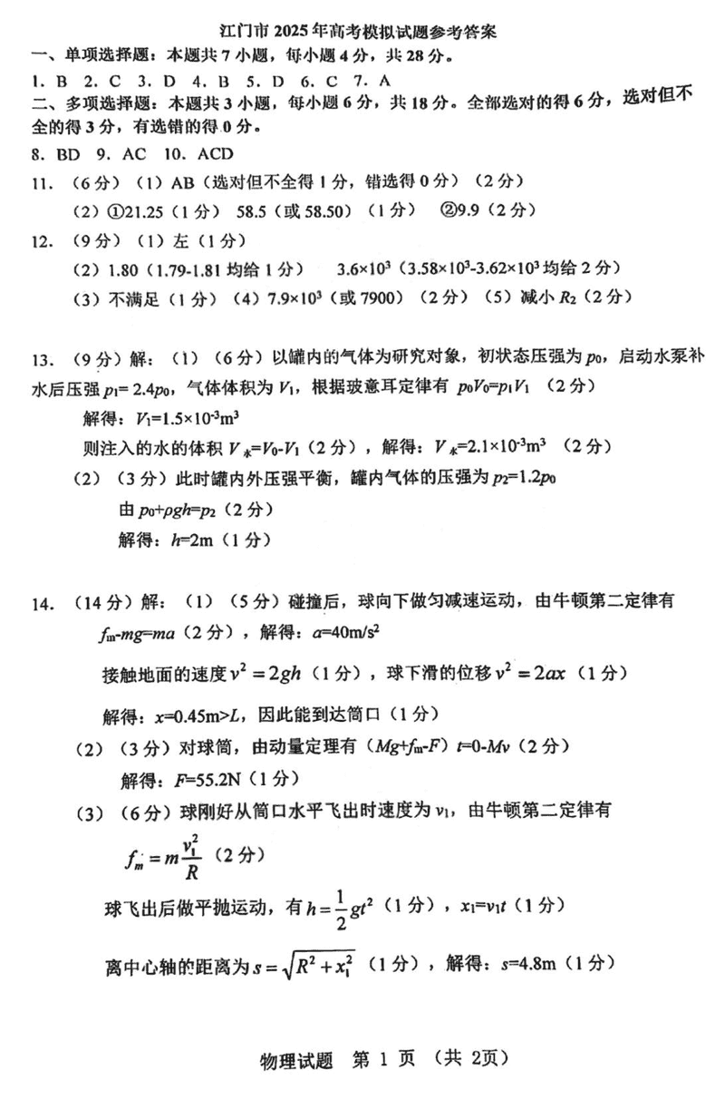 广东江门2025届高三一模物理试题及答案 时间:2025-03-11 广东 理综试题 广东江门2025届高三一模物理考试已于近日开考,为方便考生考后及时查看考试情况,查漏补缺、弥补不足,本文整理了试题答案解析相关信息! 汇总:广东江门2025届高三一模试题及答案汇总 物理试题及答案解析